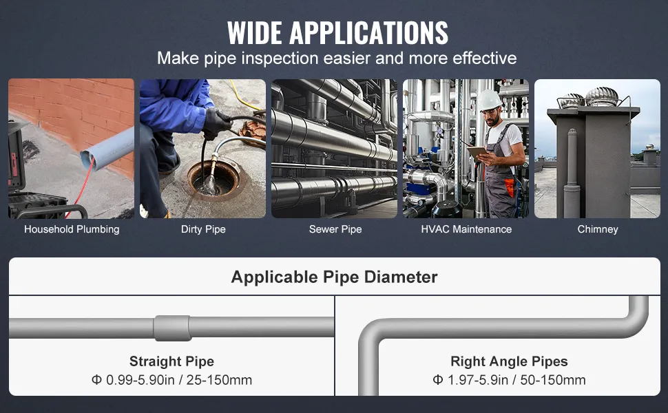 Ampie applicazioni: la telecamera di ispezione professionale VEVOR è adatta al 99,9% delle riparazioni di condotte di medie e grandi dimensioni. Il suo robusto telaio in acciaio inossidabile offre un supporto stabile.