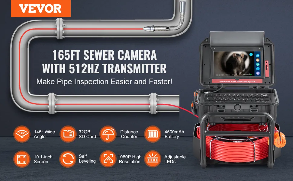 VEVOR Telecamera per Fognatura 50 m Telecamera per Scarichi Autolivellante, Schermo Tattile 256,54 mm Trasmettitore 512 Hz e Contatore di Distanza, Telecamera Idraulica a Serpente IP67 con Luci-12 LED