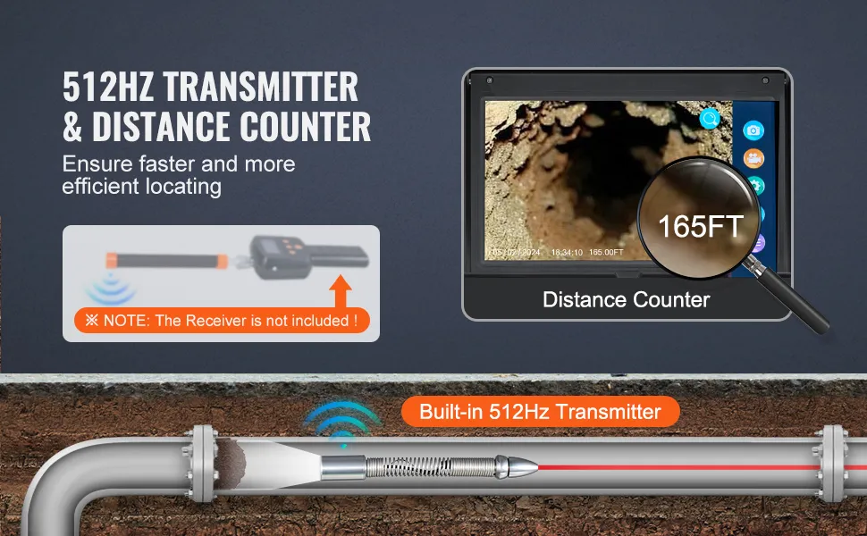 Localizzazione precisa e visualizzazione della distanza: la nostra telecamera per fognatura da 165 piedi/50 m ha un trasmettitore sonda da 512 Hz integrato per un monitoraggio accurato della posizione.
