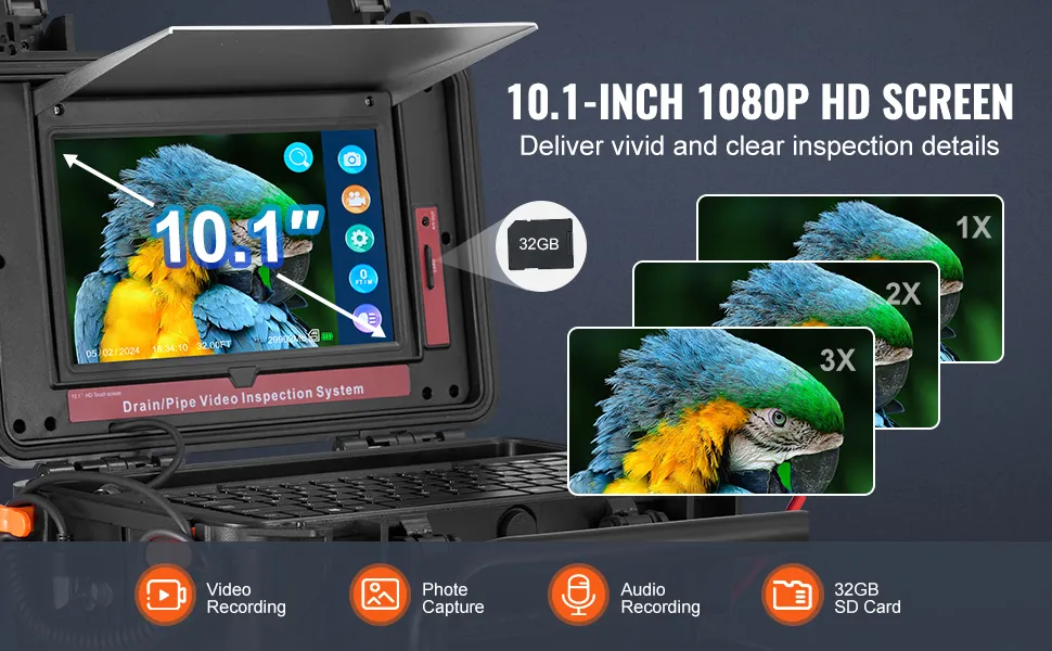La telecamera idraulica professionale è dotata di un touch screen HD da 10,1 pollici/256,54 mm, che fornisce immagini nitide e chiare per ispezioni dettagliate. Cattura senza sforzo ogni dettaglio con la registrazione video, lo scatto di foto e lo zoom digitale 3x.
