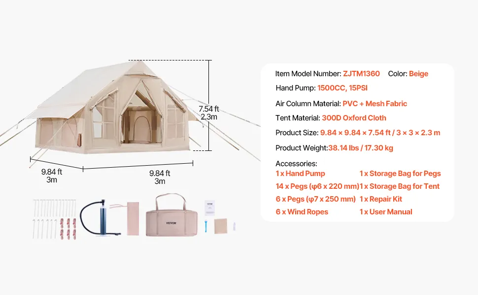 Spazioso 97 SQ.FT. per il comfort: questa tenda da campeggio gonfiabile offre un'area spaziosa (9,84 x 9,84 x 7,54 piedi /3 x 3 x 2,3 m), che può ospitare comodamente 4-6 persone. È ideale per il campeggio in famiglia, materassi ad aria e attrezzatura per esterni, ed è anche perfetta per far partecipare all'avventura anche gli animali domestici
