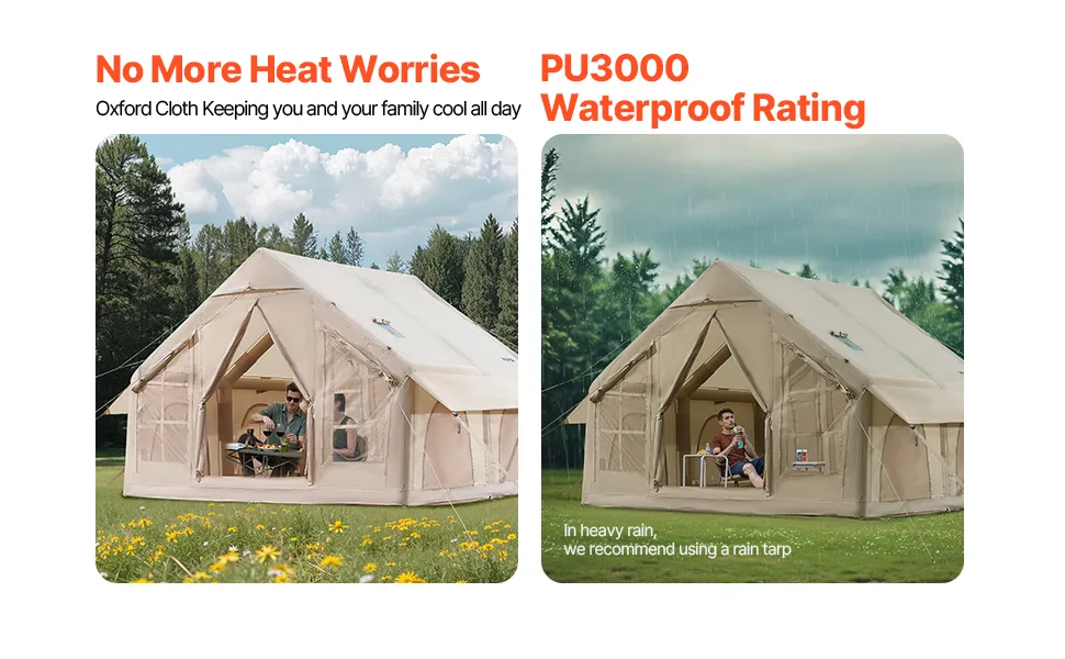 Durevole e resistente alle intemperie: realizzata in tessuto Oxford di alta qualità, questa tenda da campeggio gonfiabile blocca la luce solare dannosa e vanta un grado di impermeabilità PU3000, mantenendoti asciutto durante la pioggia leggera. Picchetti antivento e corde riflettenti garantiscono sicurezza durante la notte