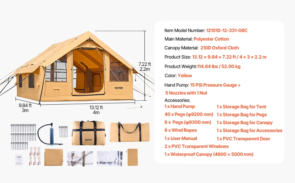 VEVOR Tende Gonfiabili per Campeggio, Tenda Gonfiabile per 5-8 Persone con Pompa a Mano, per 4 Stagioni con 2 Lucernari, Baldacchino, Presa per Stufa, 2 Porte e Finestre a Rete Borsa Portaoggetti