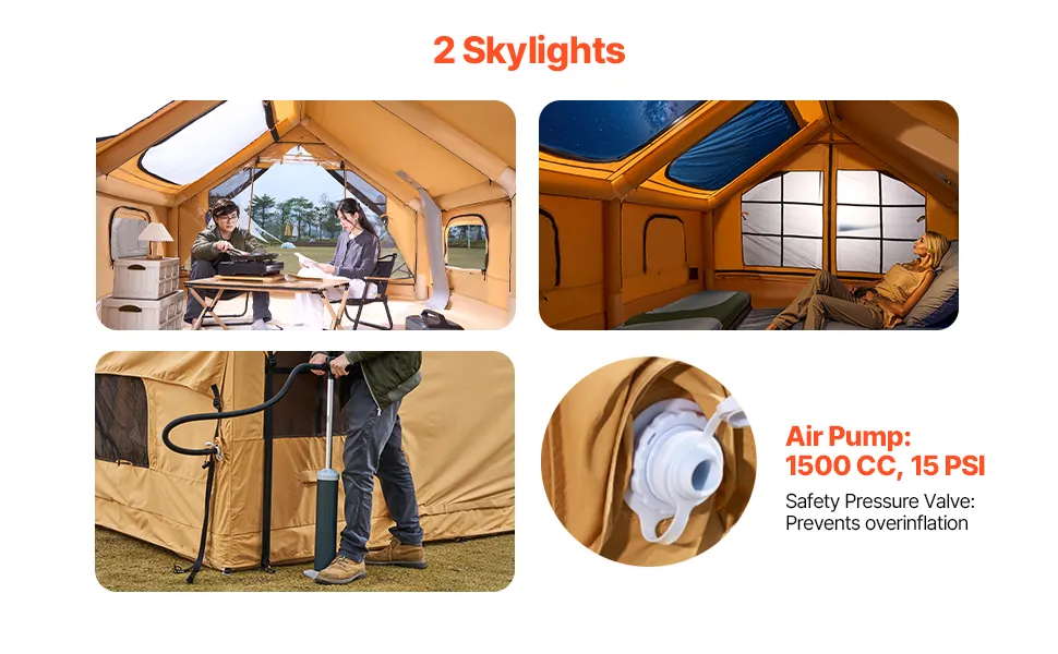 Con una pompa ad alta pressione da 1500 CC e 29 PSI, questa tenda da campeggio gonfiabile si gonfia in 10-15 minuti, eliminando la necessità di una configurazione tradizionale del telaio. La valvola di pressione impedisce il gonfiaggio eccessivo, garantendo un utilizzo più sicuro.