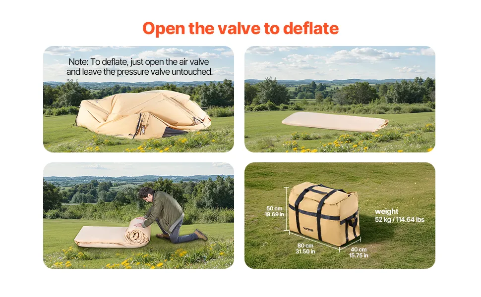 Basta aprire la valvola per sgonfiare, piegare e riporre la tenda gonfiabile nella borsa portaoggetti. Il suo design leggero e compatto la rende ideale per i viaggi su strada o per il campeggio in famiglia. Facile da imballare e riporre velocemente.