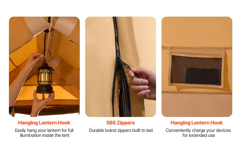 Le tende glamping per il campeggio sono dotate di ganci per appendere luci da campeggio, cerniere SBS resistenti e una comoda presa di corrente per migliorare la tua esperienza di campeggio. Questi dettagli pratici aggiungono ulteriore comfort e facilità al tuo soggiorno all'aperto.