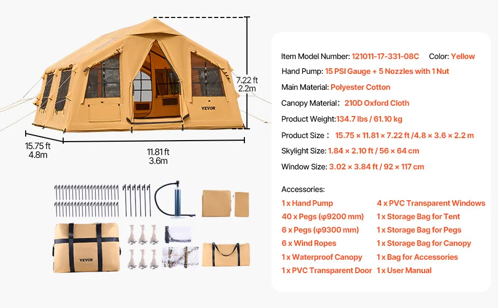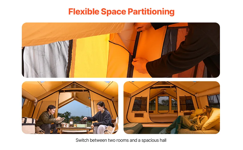 186 SQ.FT. Spazioso interno: con 186 piedi quadrati di spazio (15,75 x 11,81 x 7,22 piedi / 4,8 x 3,6 x 2,2 m), questa tenda da campeggio gonfiabile può ospitare comodamente 8-12 persone. Include tende rimovibili per creare una disposizione con due camere da letto o una spaziosa zona giorno