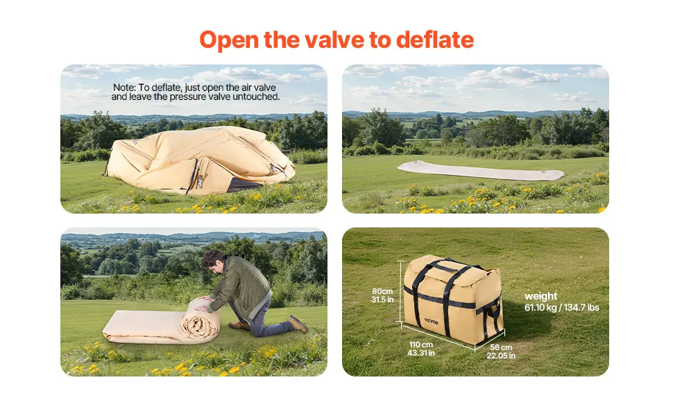 Basta aprire la valvola per sgonfiare, piegare e arrotolare la tenda da campeggio gonfiabile come da manuale utente, riponendola nella borsa portaoggetti per un facile trasporto. Leggera e portatile, è ideale per viaggi su strada o gite in famiglia.