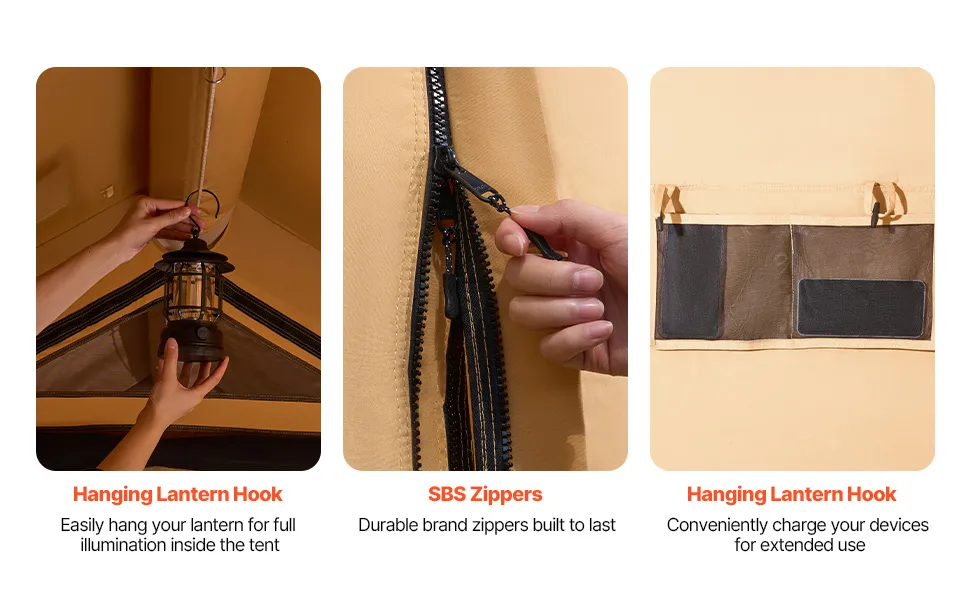La tenda da campeggio di lusso è dotata di dettagli pratici, come ganci per appendere luci da campeggio, cerniere SBS resistenti e una comoda presa di corrente, che renderanno la tua esperienza di campeggio più comoda e piacevole.