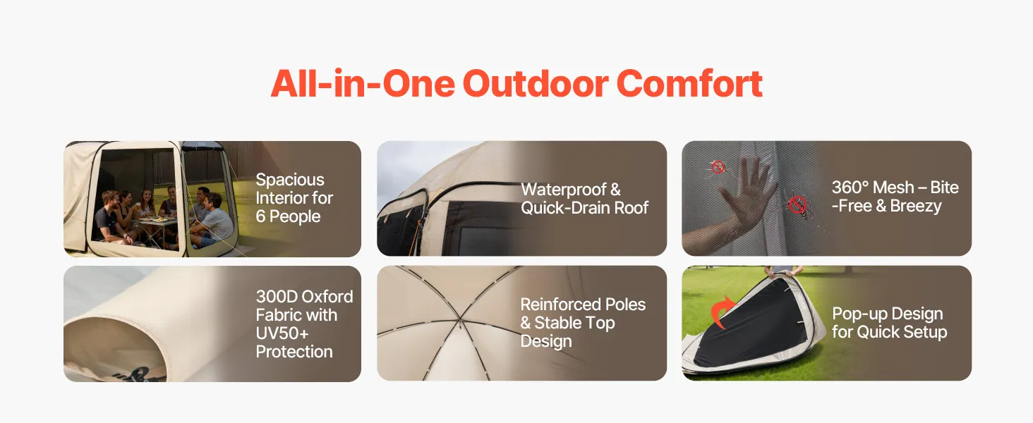 Protezione da punture e intemperie: la rete ad alta densità a 360° tiene lontani i morsi, mentre il tessuto Oxford 300D con protezione impermeabile e solare ti protegge da sole e pioggia. Resta fresco e comodo con la nostra zanzariera