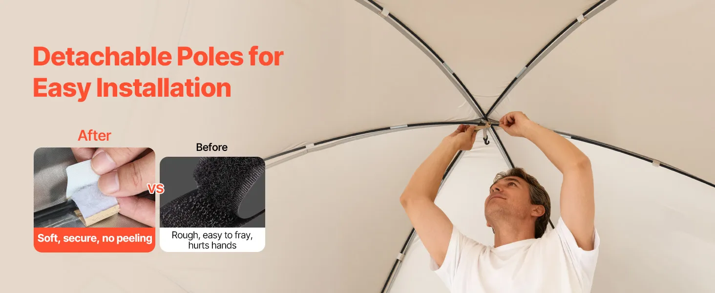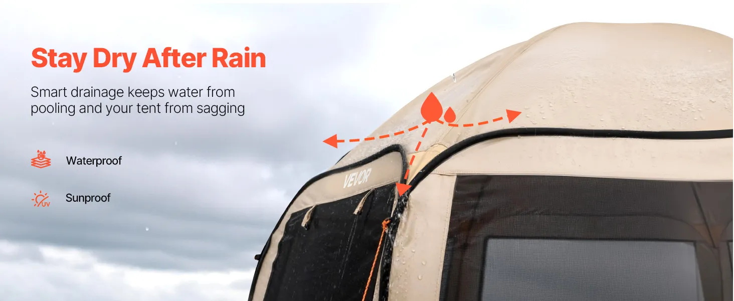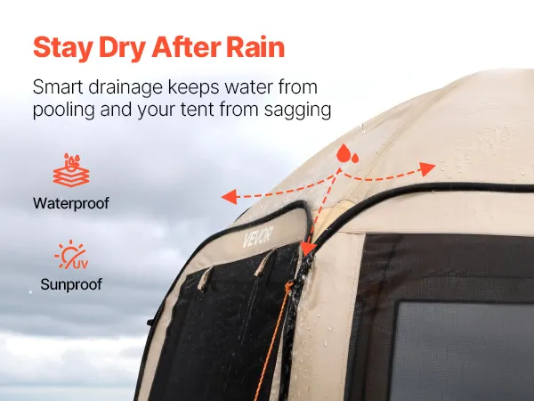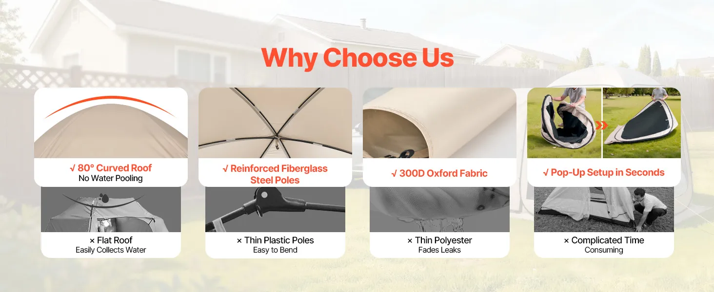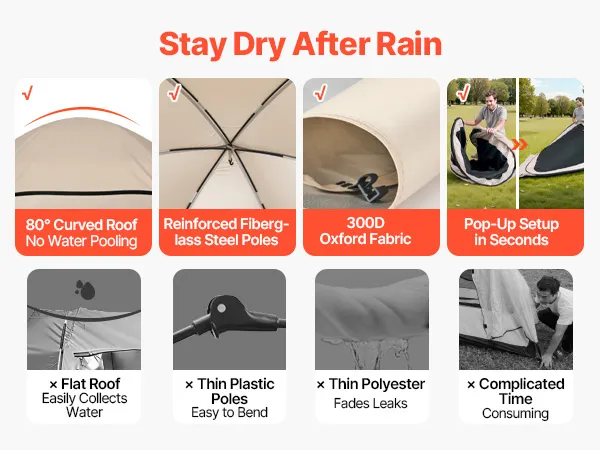 Struttura stabile e antivento: i pali rinforzati in fibra di vetro e acciaio mantengono la tenda pop-up in posizione verticale anche in condizioni di vento. Il design curvo della parte superiore evita l'accumulo di acqua e cedimenti