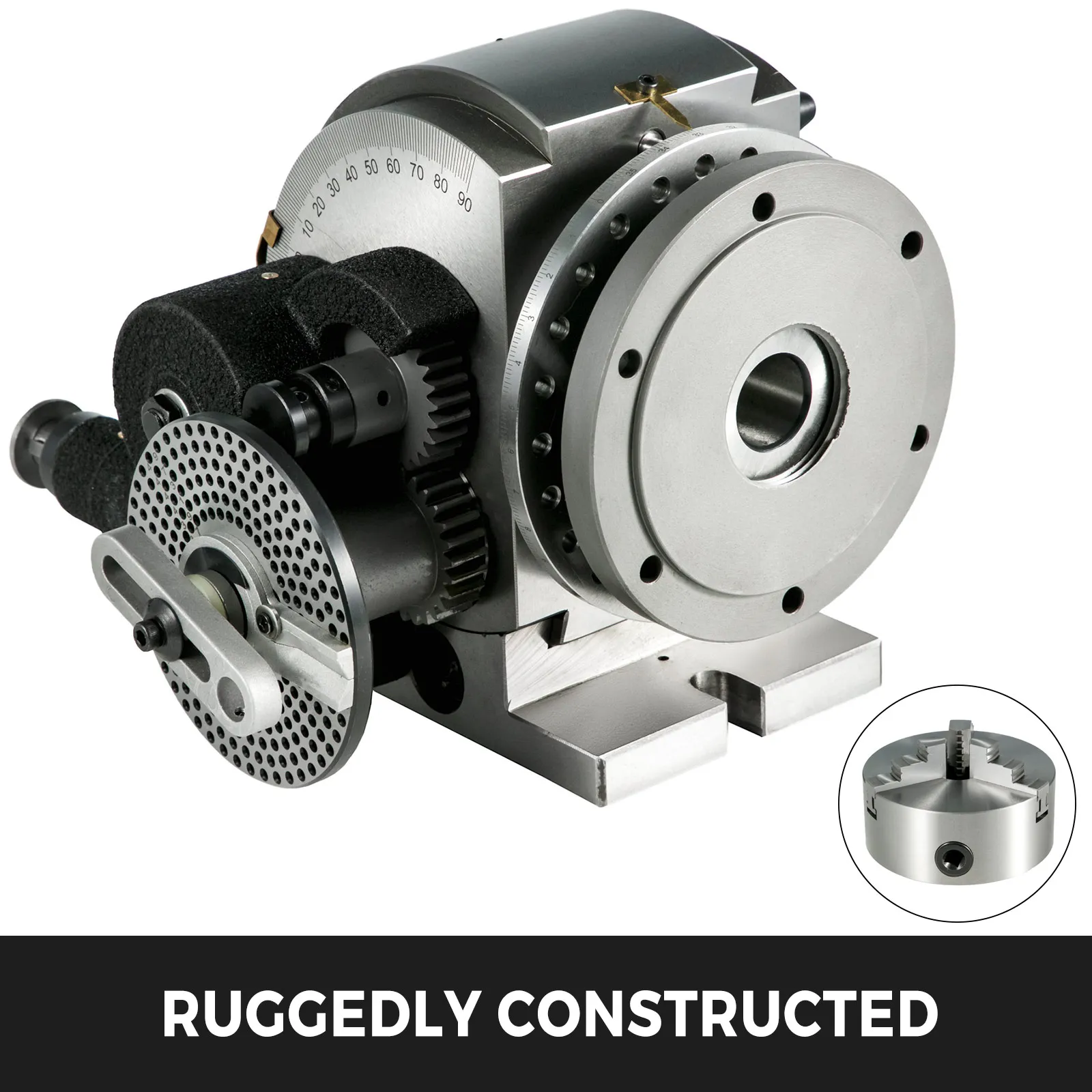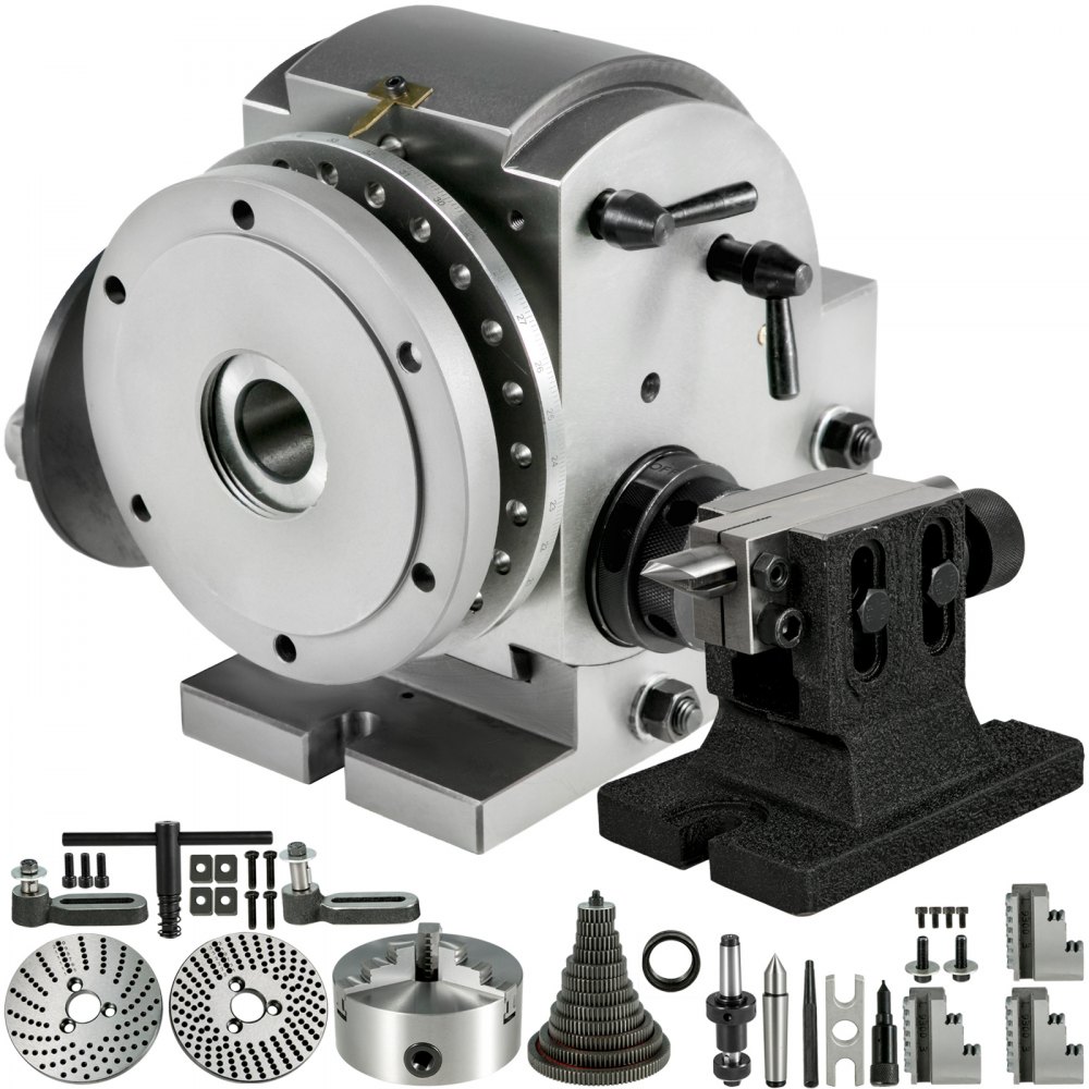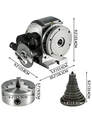 • 【TESTA DIVISIONE REGOLABILE】 - La testa di divisione semi-universale presenta un mandrino a 3 ganasce da 3". La paletta è regolabile dalla posizione orizzontale a 90 gradi verso l'alto. Altezza centrale: 6" / 150mm. Liberate altre 3 ganasce per mandrino da 6".