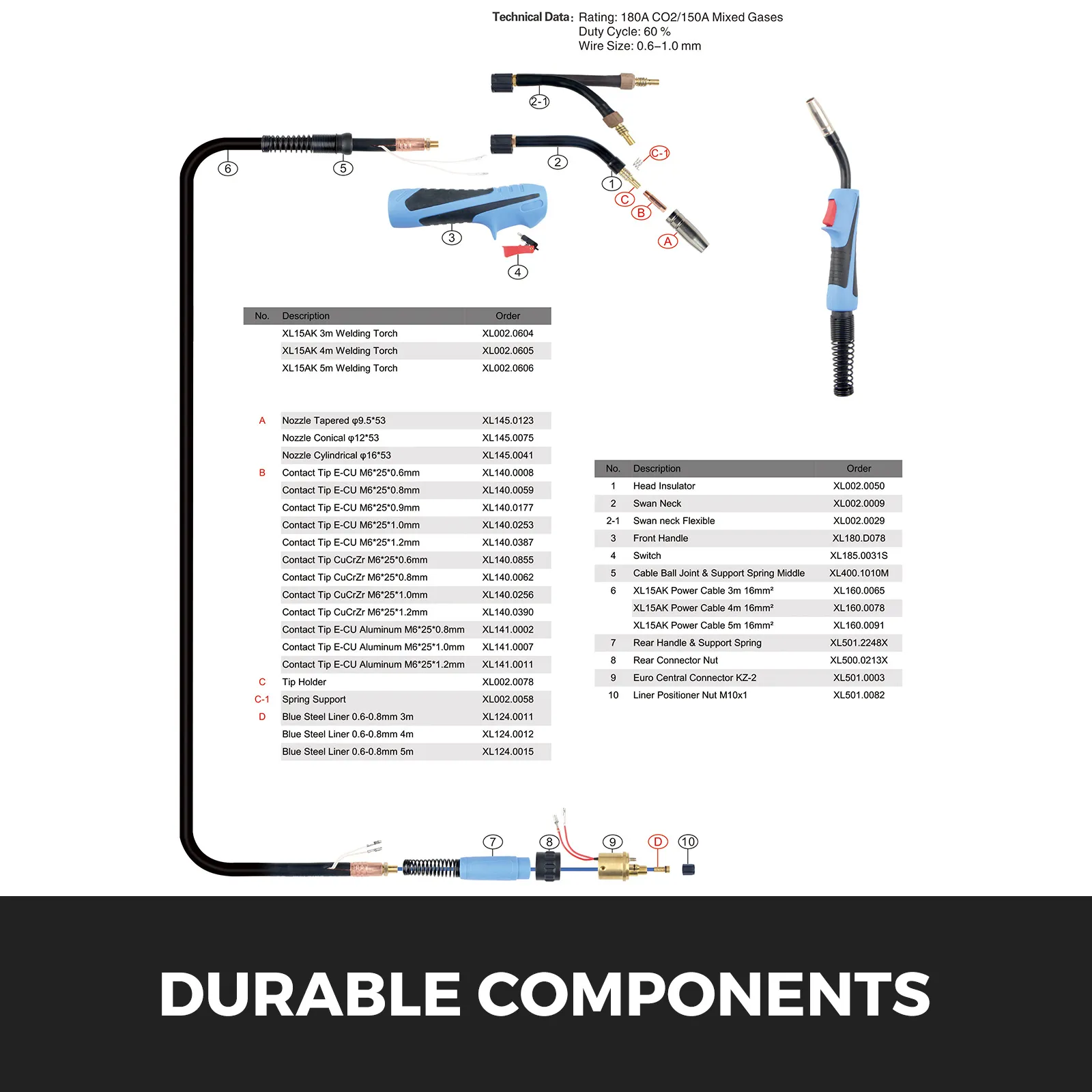 Torcia di saldatura di protezione CO2 MB-15 premio con cavo flessibile da 3 m (9,8 piedi). Adottare un ugello con design ispessente senza cuciture, giunti in rame puro e cavo privo di ossigeno. È più facile da installare. Impugnatura ergonomica, sicura e comoda da usare.