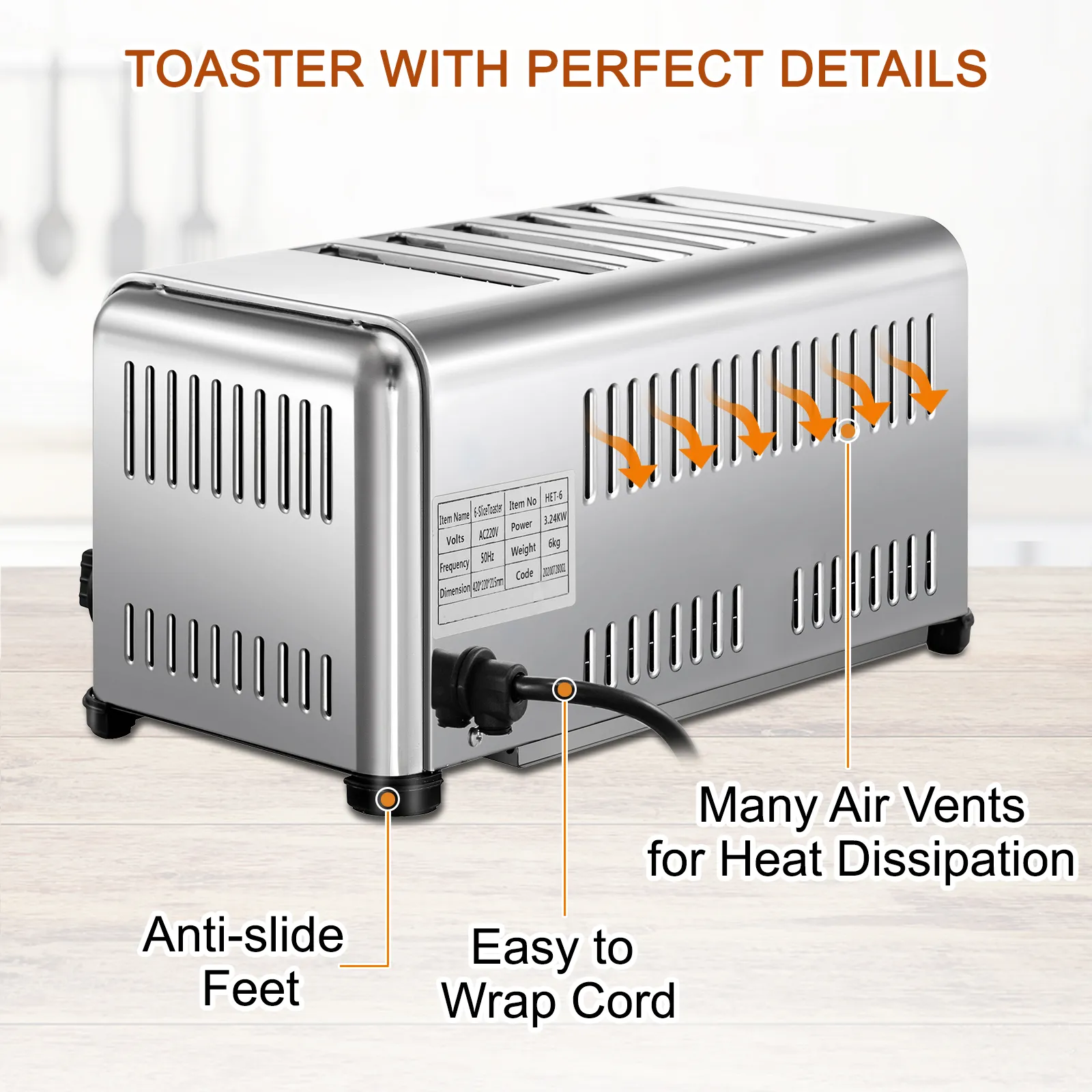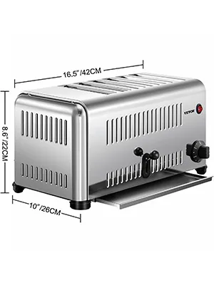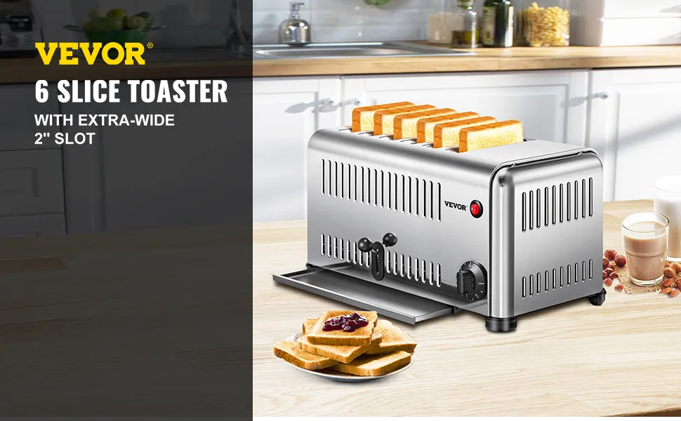Qui ti offriamo un tostapane in acciaio inossidabile, che offre praticamente tutto ciò di cui hai bisogno in un tostapane. Il nostro tostapane a 6 scomparti è ottimo per preparare un pane croccante e delizioso per la tua famiglia e i tuoi clienti.