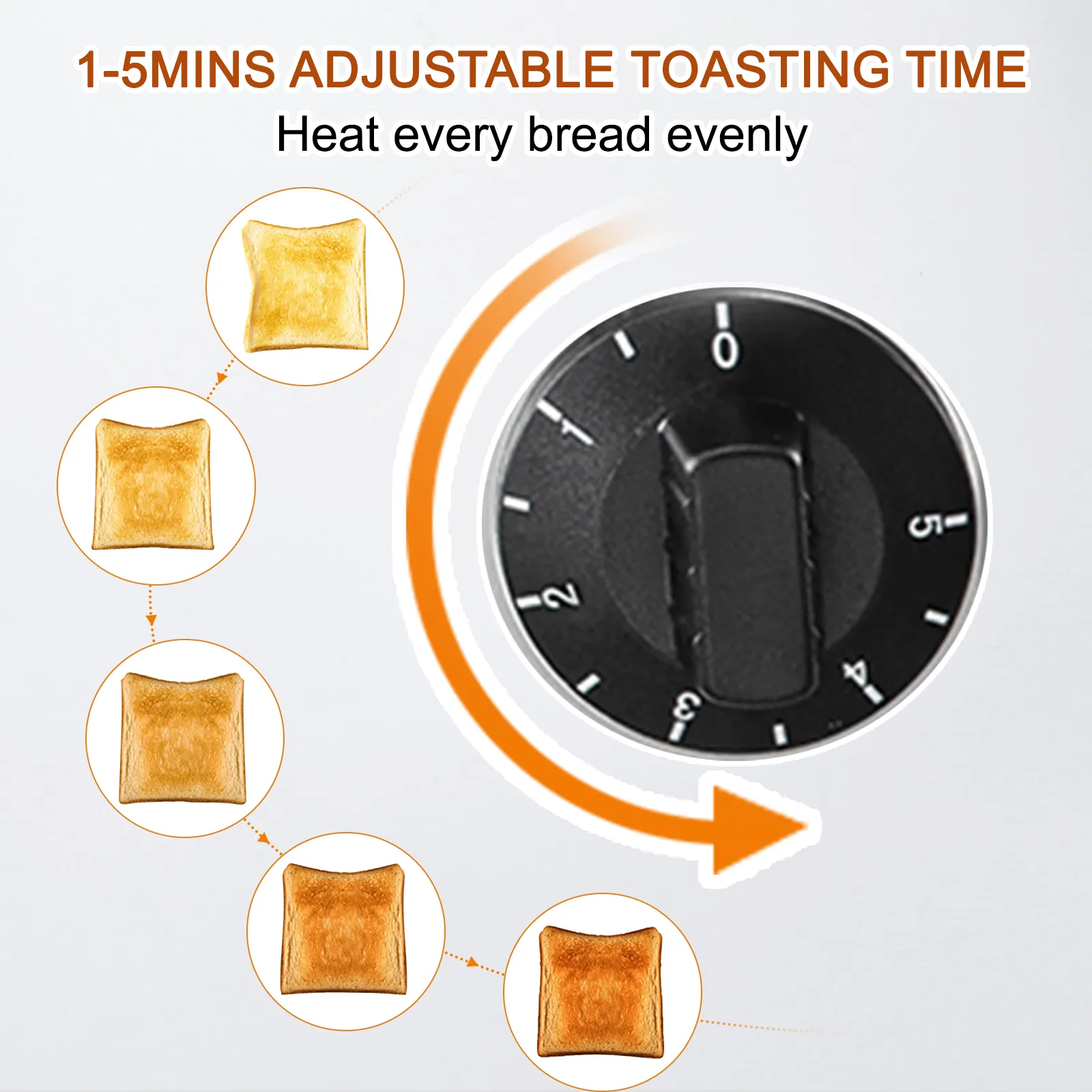 Con una semplice rotazione della manopola puoi tostare velocemente il pane in base alle tue esigenze. Il tempo di tostatura di 1-5 minuti fornisce un pane delizioso con sfumature diverse.