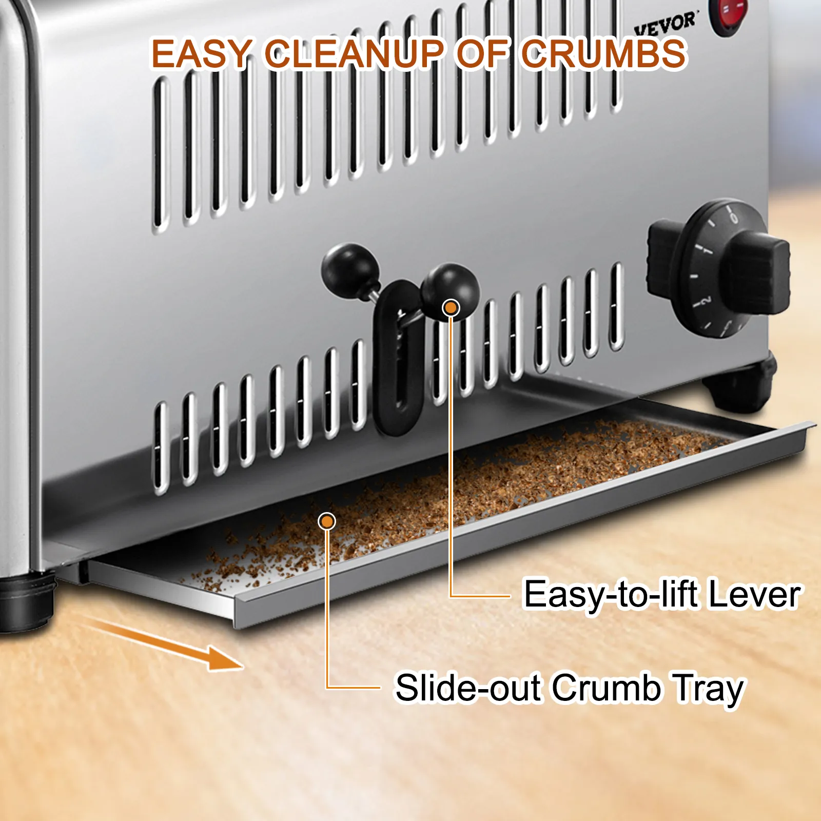 Il vassoio raccogli briciole rimovibile del nostro tostapane d'argento è veloce e comodo da pulire secondo necessità. Inoltre, puoi recuperare facilmente e in sicurezza il pane grazie alla leva di sollevamento.