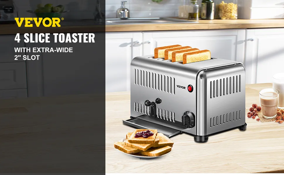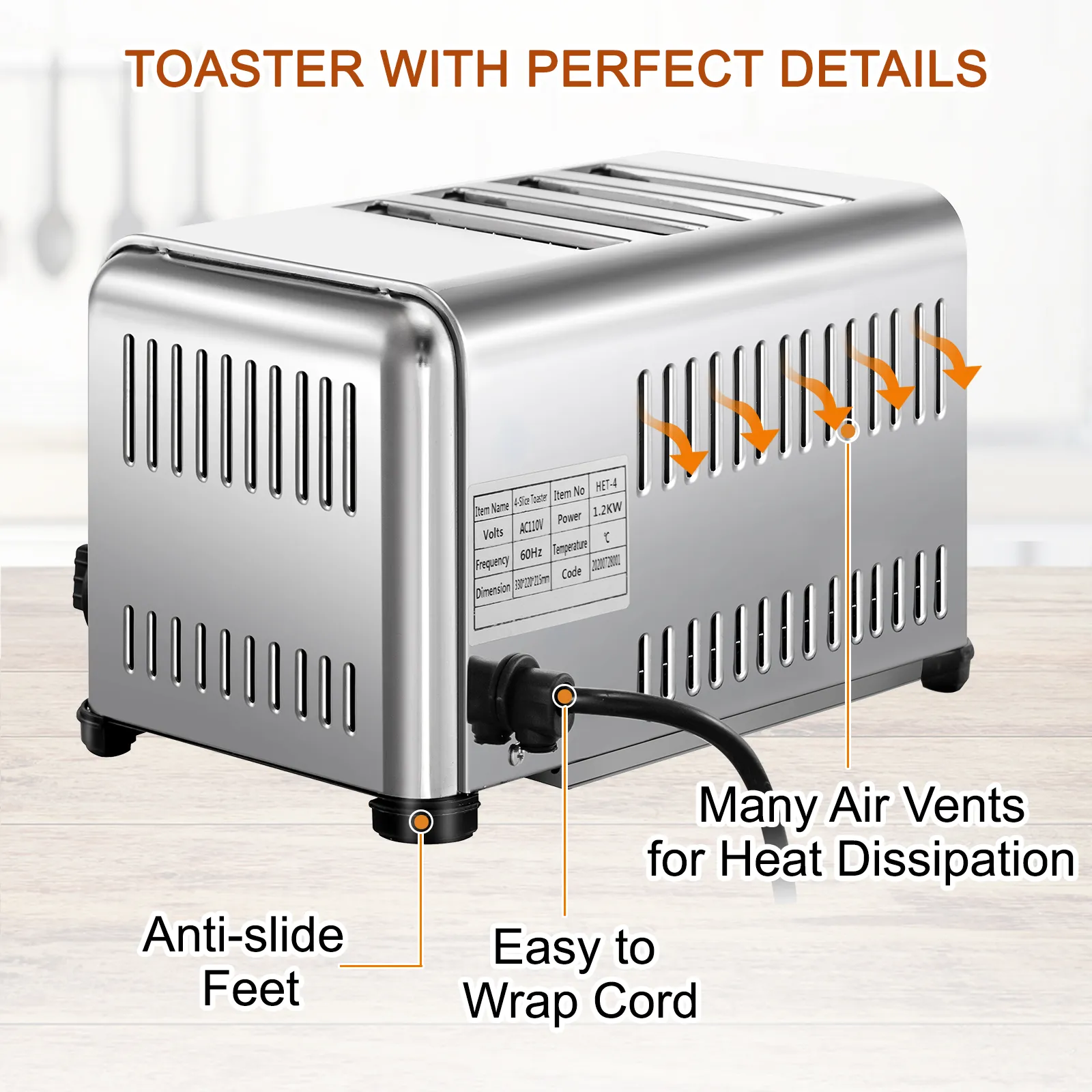 Qui ti offriamo un tostapane in acciaio inossidabile, che offre praticamente tutto ciò di cui hai bisogno in un tostapane. Il nostro tostapane a 4 scomparti è ottimo per preparare pane croccante e delizioso per la tua famiglia e i tuoi clienti.