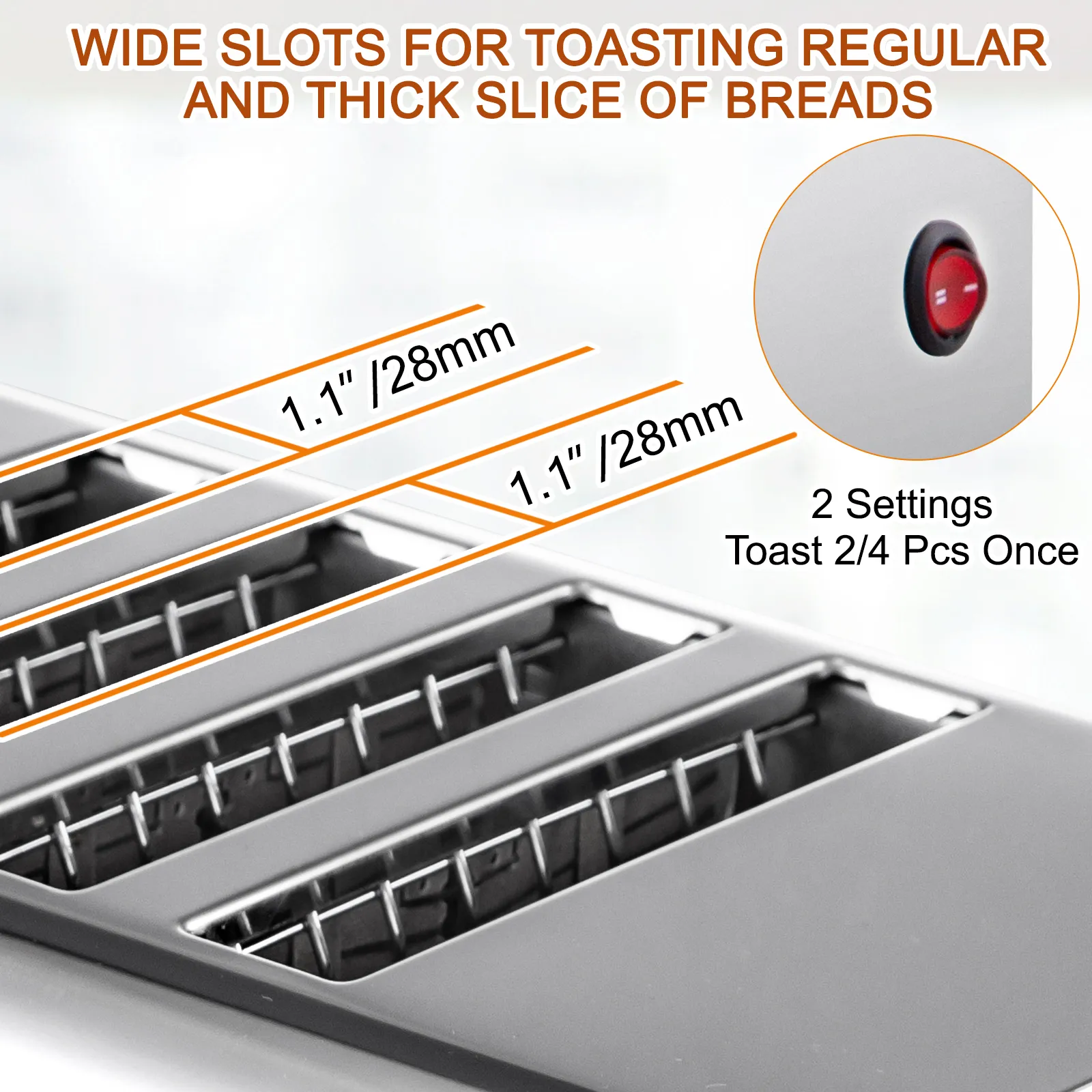 Ciascuna delle quattro fessure extra larghe misura 150 mm / 6'' di lunghezza, 28 mm / 1,1'' di larghezza e 140 mm / 5,5'' di profondità e si adatta per tostare fette sottili e spesse di pane e bagel.
