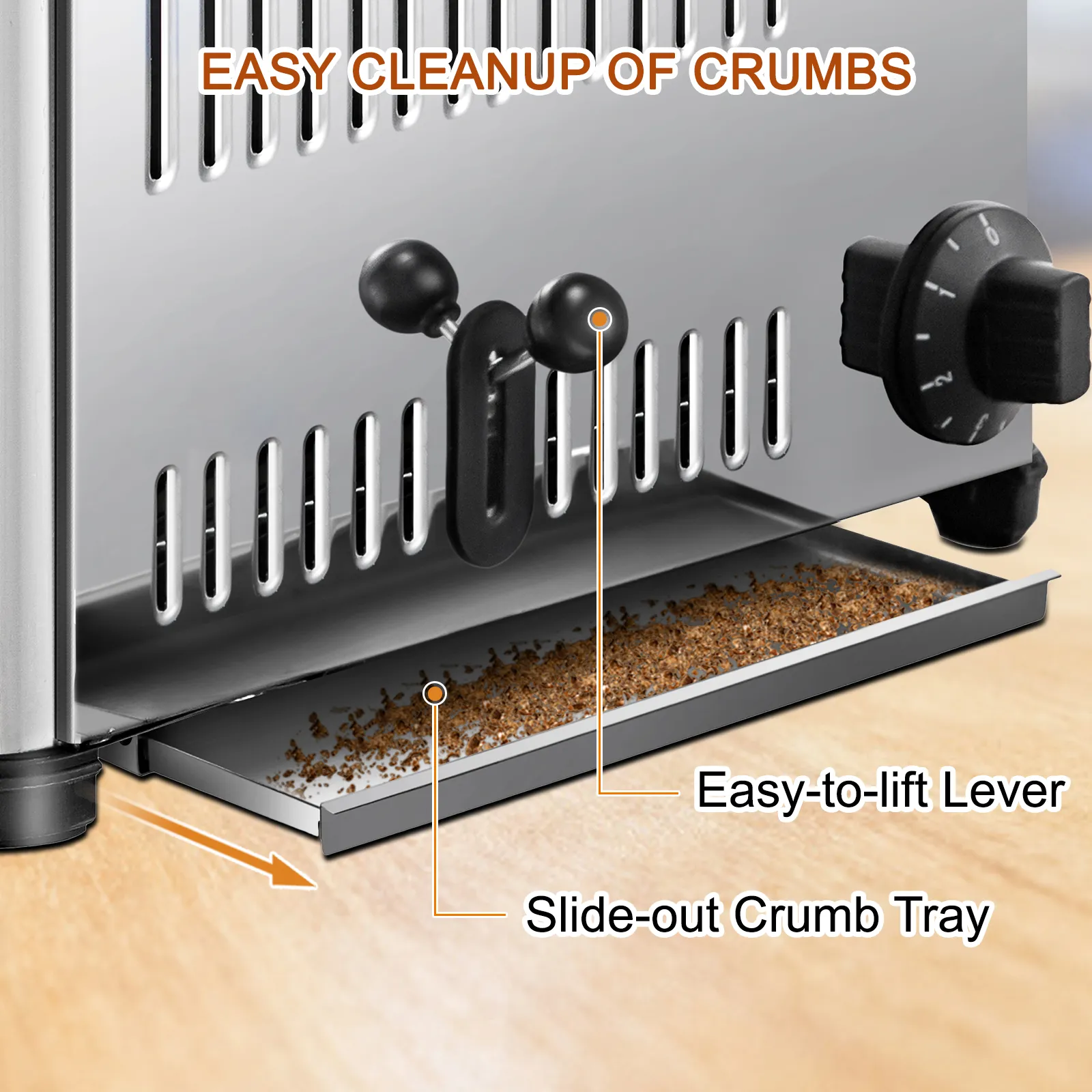Il vassoio raccogli briciole rimovibile del nostro tostapane d'argento è veloce e comodo da pulire secondo necessità. Inoltre, puoi recuperare facilmente e in sicurezza il pane grazie alla leva di sollevamento.