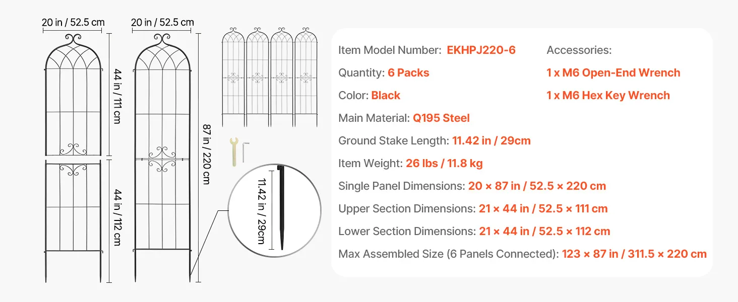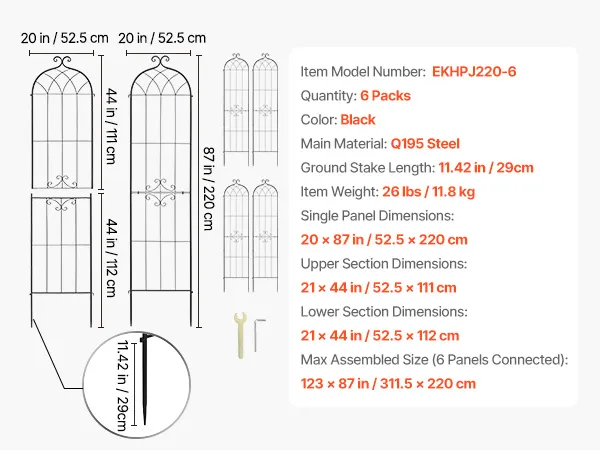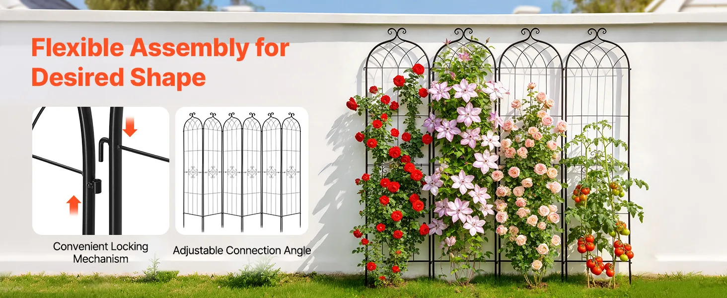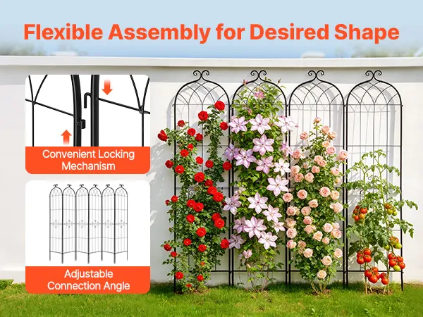 Ogni traliccio è composto da due sezioni che si assemblano rapidamente utilizzando la chiave e le viti incluse. I connettori ad incastro integrati consentono di collegare più pezzi e di regolare gli angoli in modo flessibile, facilitando la creazione della forma ideale per il vostro giardino.