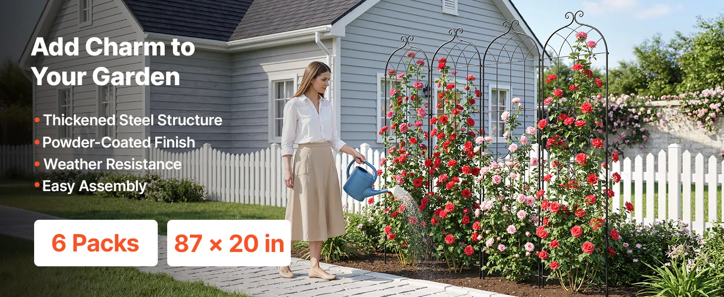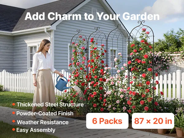 Questo traliccio in acciaio per rose da 6 pezzi aggiunge struttura e fascino con il suo design dal profilo arcuato che si integra perfettamente in qualsiasi paesaggio. Offre un generoso supporto verticale per fiori, viti e ortaggi che possono arrampicarsi e crescere.