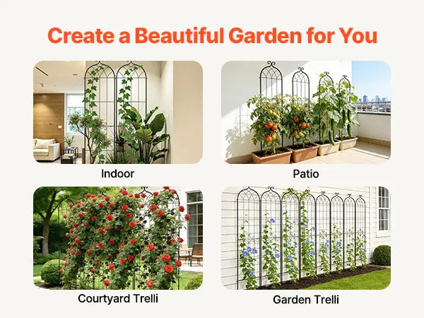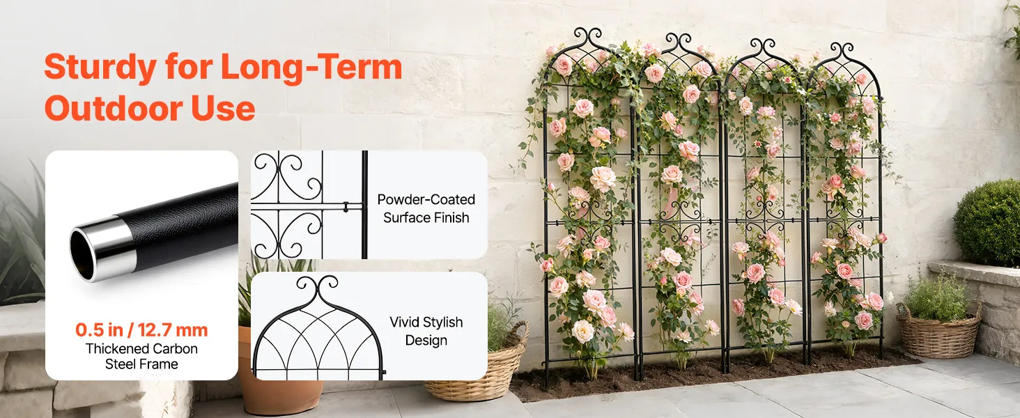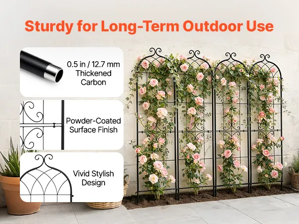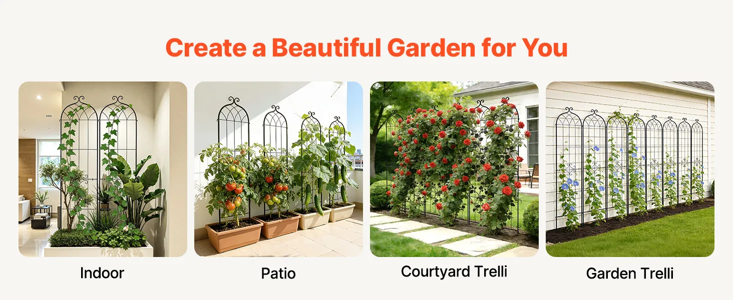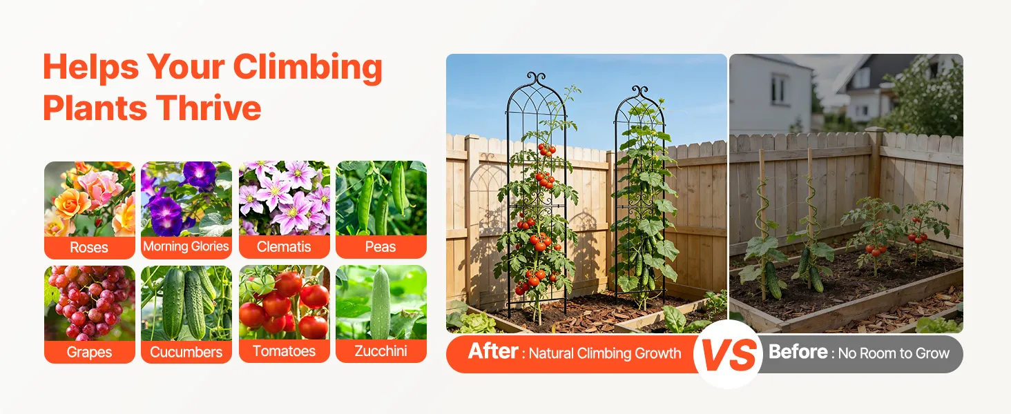 Supporto per la crescita: Progettato non solo per rose e viti rampicanti, questo traliccio fornisce supporto anche per pomodori, cetrioli e piselli. Supporta le piante a crescere verso l'alto in spazi limitati, migliorando la circolazione dell'aria e l'esposizione al sole