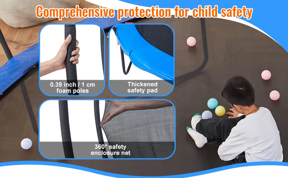 Protezione completa: questo trampolino da esterno è dotato di una rete di sicurezza a 360°, con le barre della rete circostanti ricoperte da schiuma spessa 1 cm (0,39 pollici) e che racchiudono saldamente il bambino al centro. Ciò impedisce ai bambini di colpire direttamente le sbarre durante il gioco.