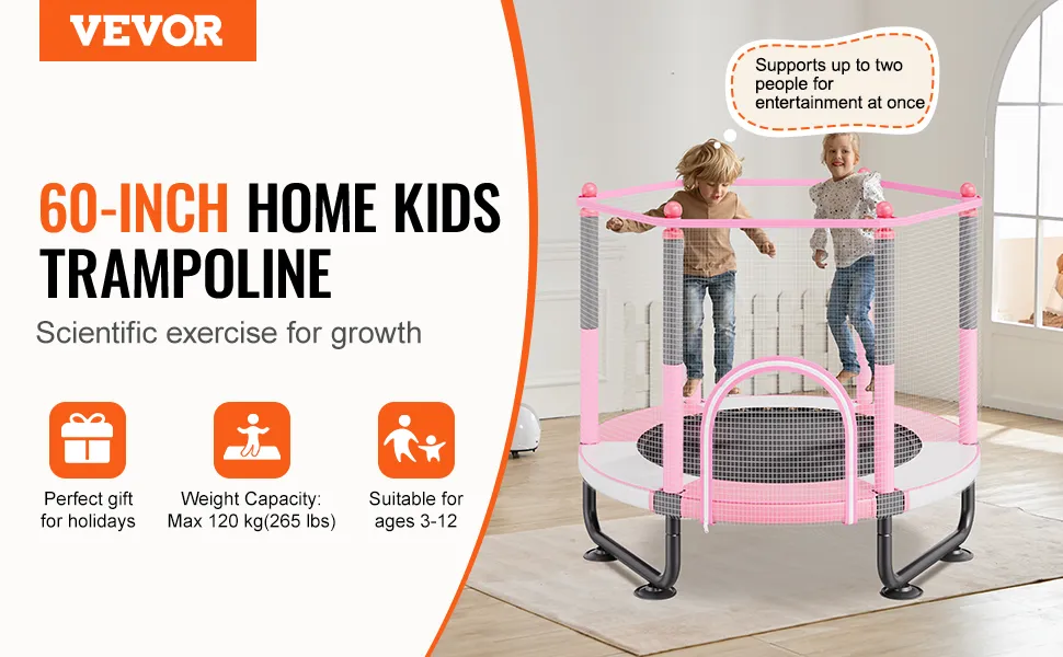 VEVOR Trampolino per Bambini 1545x1210 mm, Trampolino per Interni Esterni, Mini Trampolino Ricreativo per Bambini con Rete Sicurezza e Canestro Basket Giocattoli Bambini Trampolino per Bambini Rosa