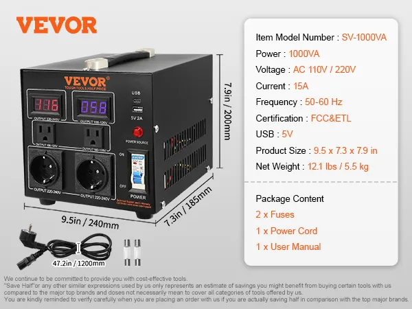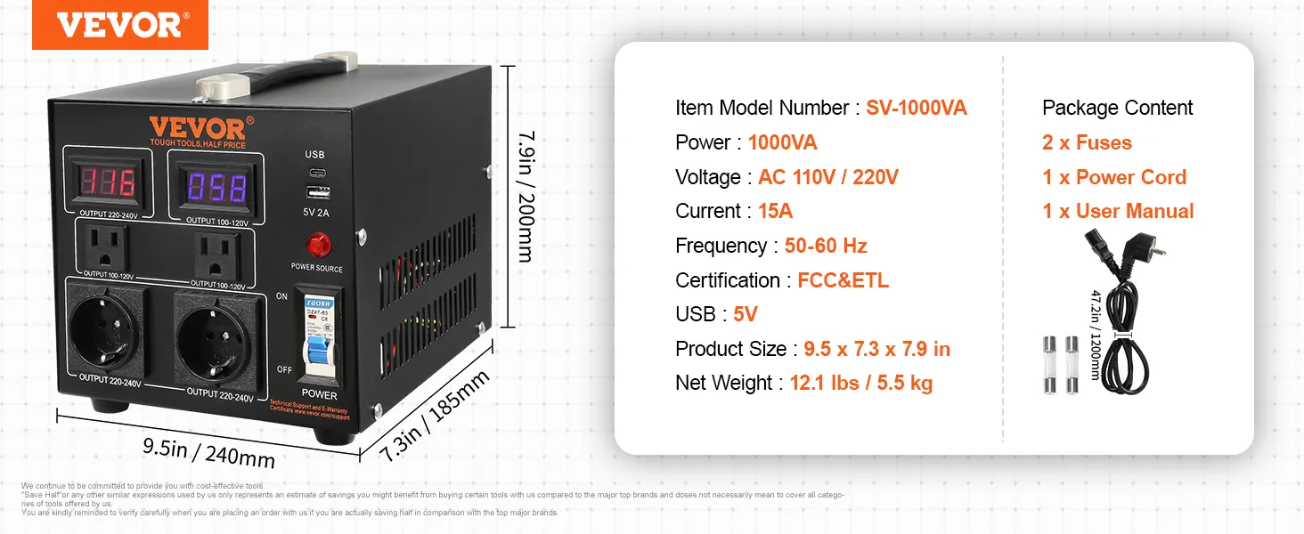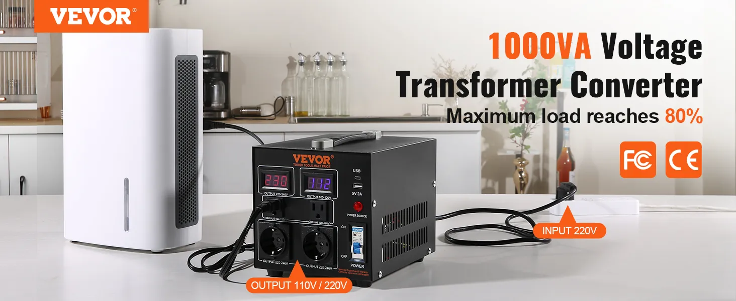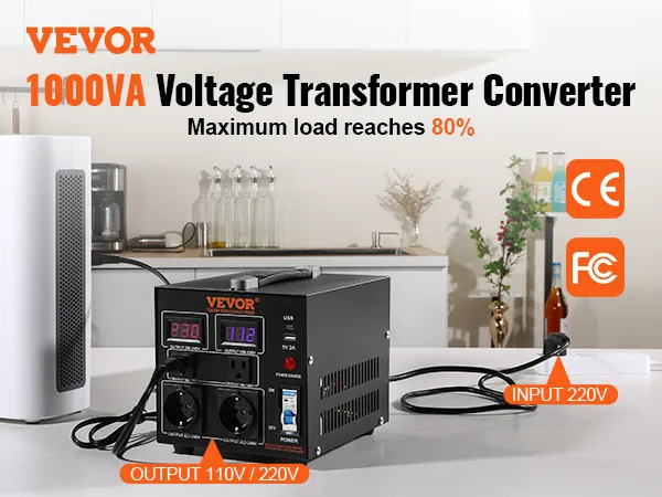 Trasformatore di Tensione da 1000 VA: questo trasformatore step up / down è dotato di 4 prese CA, incluse 2 prese di uscita US NEMA 5-15R a 3 pin, 2 prese di uscita Shucko europee, 1 porta USB da 5 V e 1 presa di tipo C. È costruito con 2 display LED che mostrano la tensione di uscita corrente in tempo reale per evitare il sovraccarico del trasformatore.