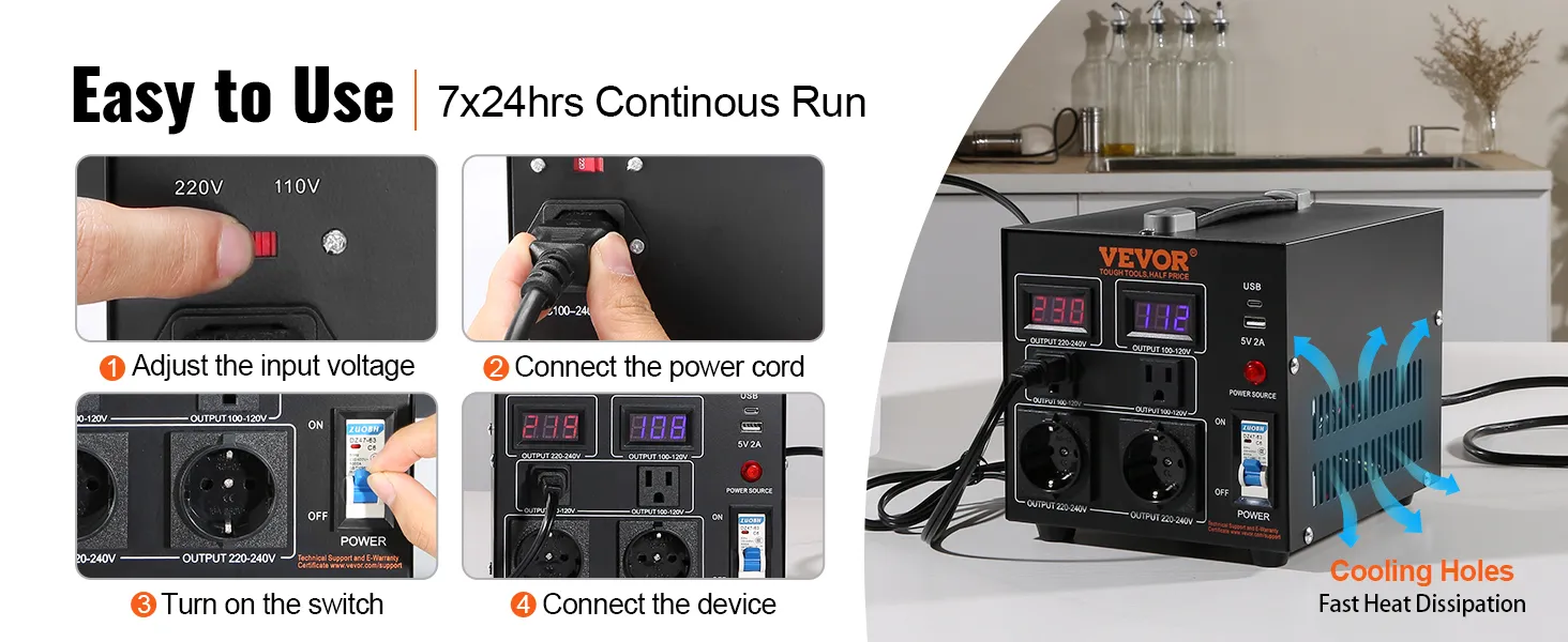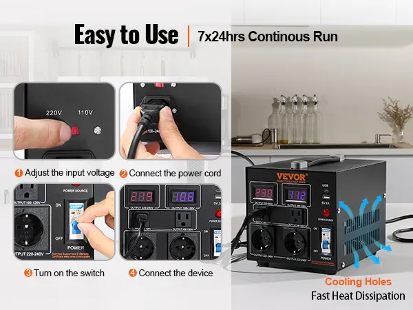 Funzionamento Efficiente: questo trasformatore di tensione adotta di bobine toroidali di alta qualità per un funzionamento continuo di 7x24 ore. Per un'esperienza migliore, si consiglia di acquistare un convertitore di tensione con una potenza di carico superiore di almeno il 25% rispetto alla potenza totale del dispositivo.