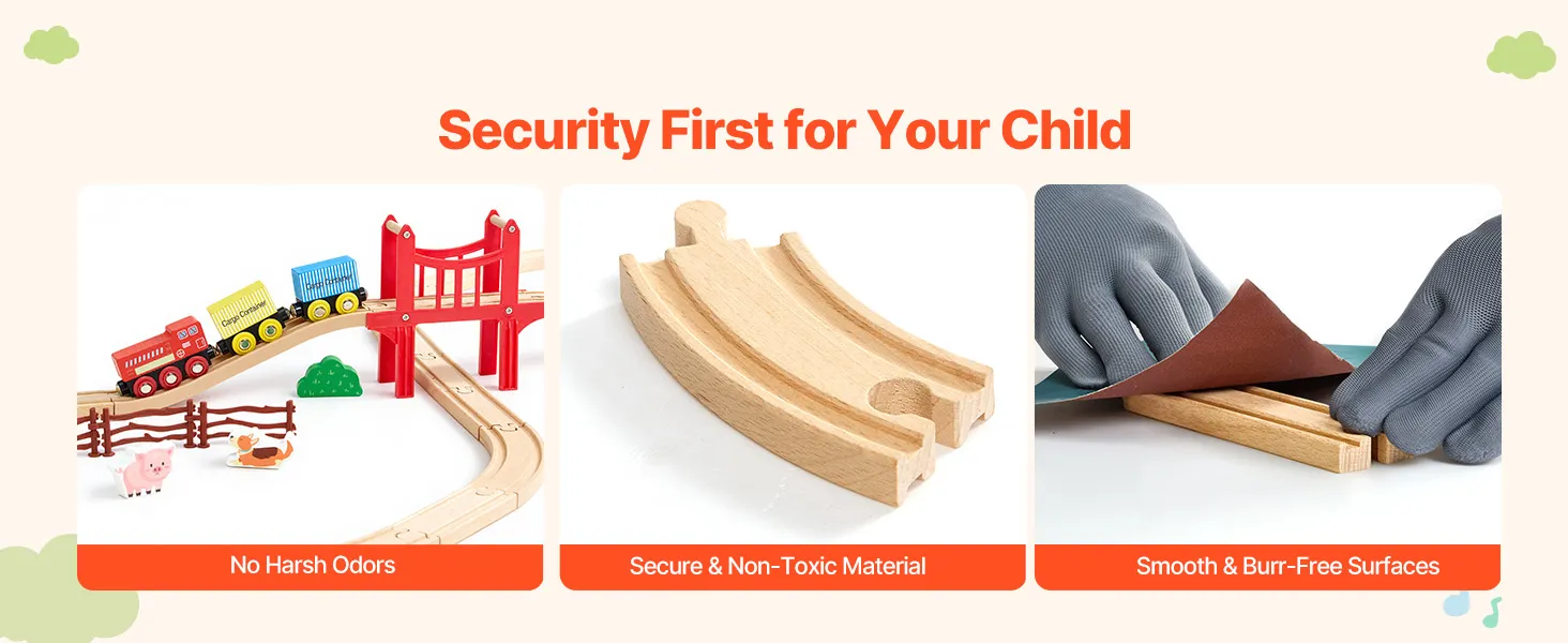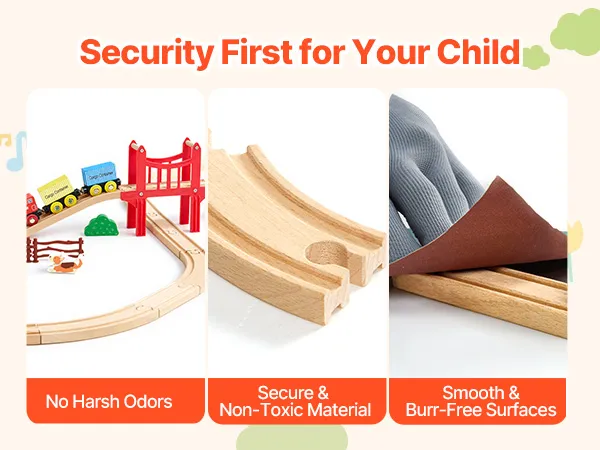 La sicurezza prima di tutto: realizzato in legno di faggio di qualità con bordi lisci. Il set di binari in legno è delicato sulle manine dei più piccoli, con collegamenti stretti e treni scorrevoli, progettati per durare anni di gioco