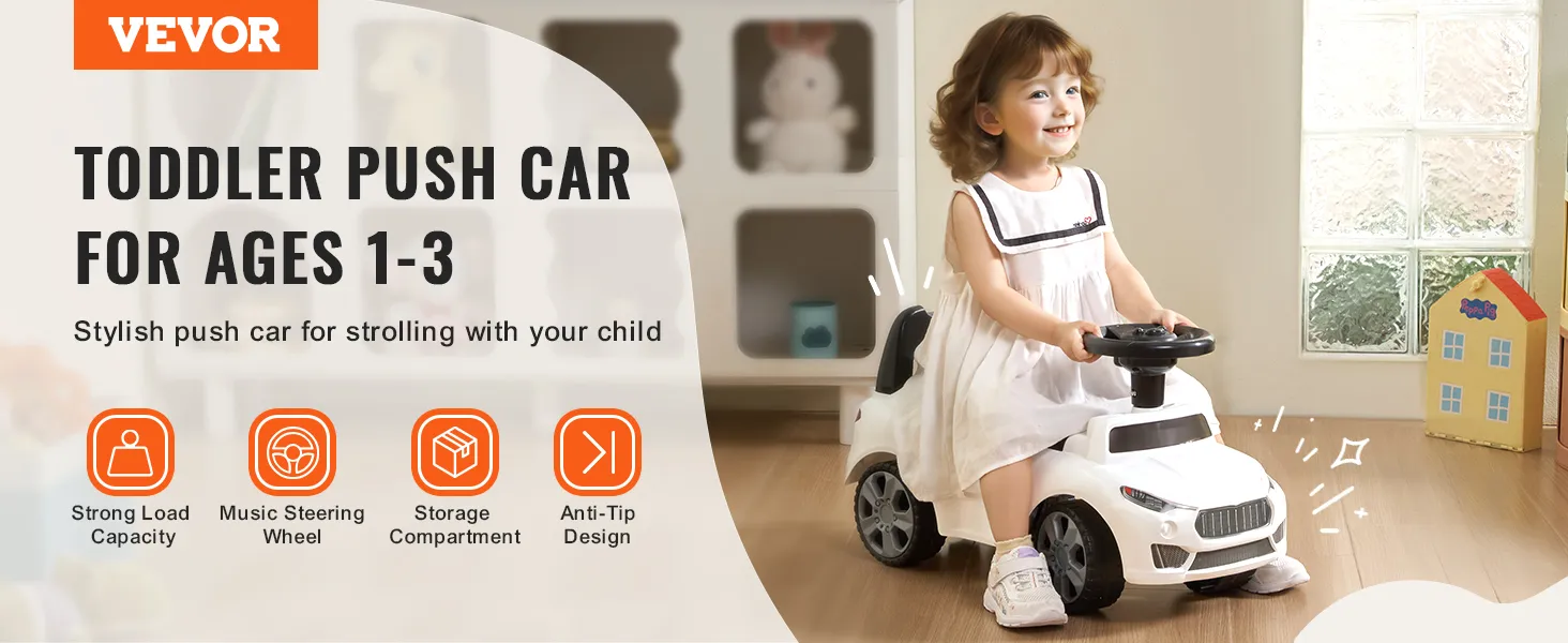 VEVOR Auto da Corsa a Spinta per Bambini, 1-3 Anni, Ride Racer, Giocattolo Guidare per Bambini Sit to Stand, Classica Auto da Guida con Volante Musicale e Vano Portaoggetti Sotto il Sedile,Bianco