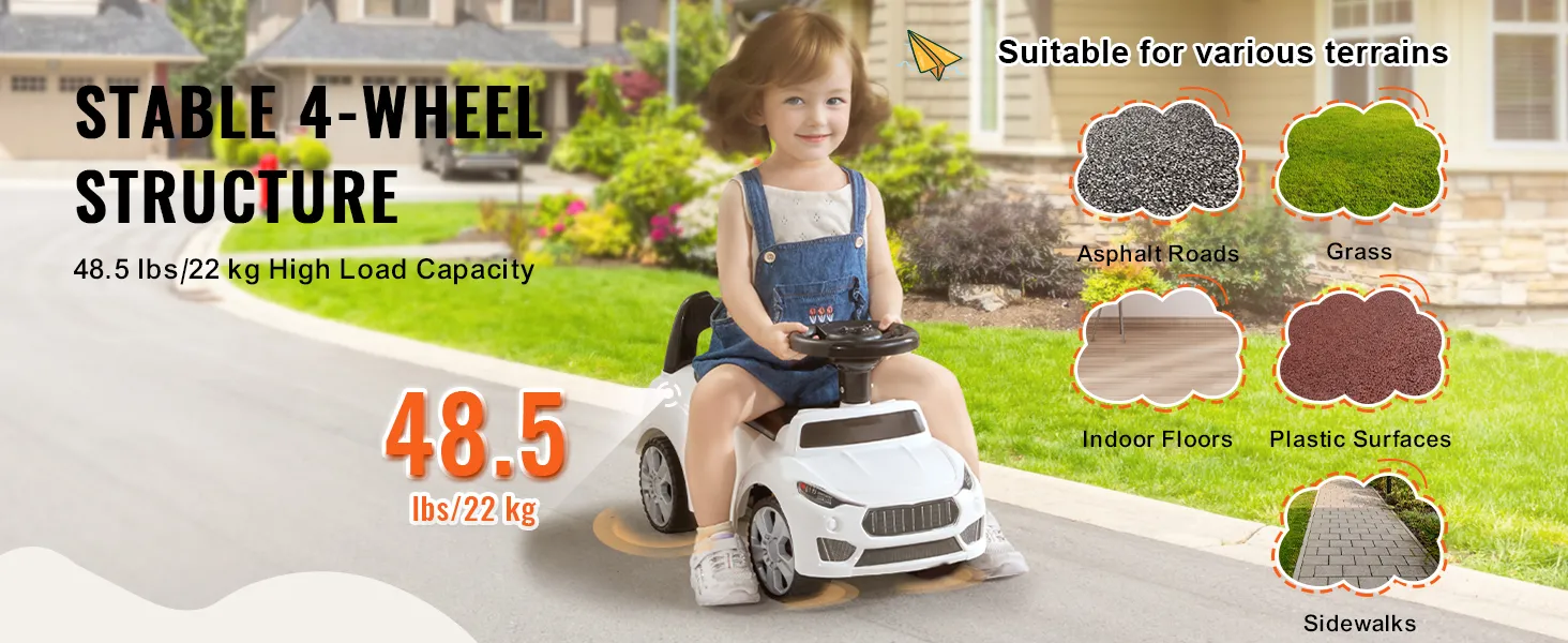 Con un robusto design a quattro ruote, questo giro in macchina per bambini scivola dolcemente su asfalto, erba e marciapiedi, mantenendo il tuo bambino al sicuro.
