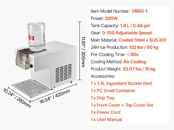 VEVOR Tritaghiaccio per Cono di Neve Macchina Elettrica per Ghiaccio a Fiocchi di Neve da 60 kg/giorno, Macchina Elettrica Tritaghiaccio con Serbatoio da 1,8 L, 260 W, per Eventi Feste Dolce