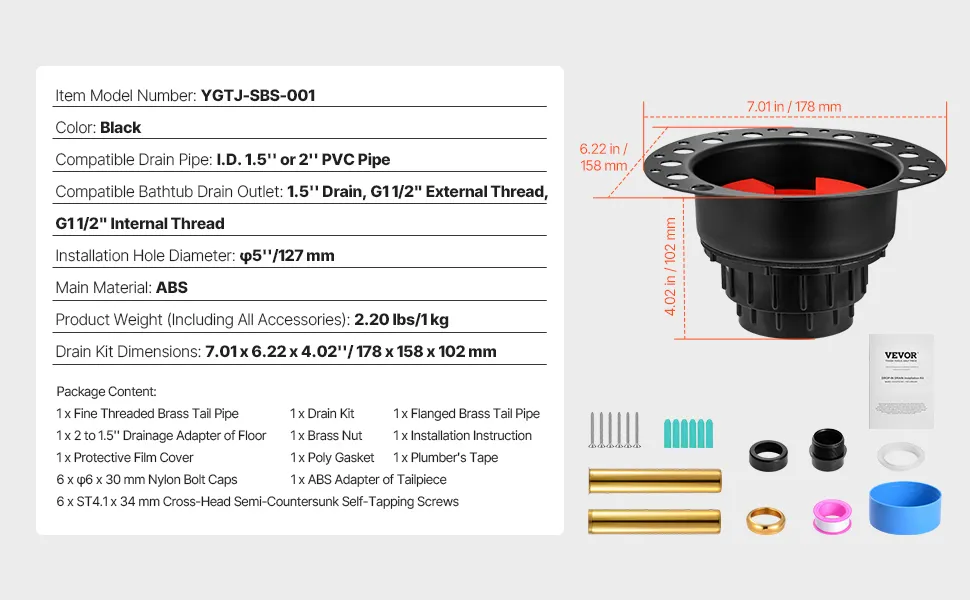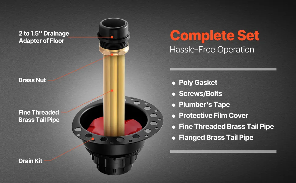 Questo kit di scarico per vasca autonomo contiene tutto ciò di cui hai bisogno, incluso kit di scarico, guarnizione in poliestere, viti/bulloni, nastro idraulico, dado in ottone, pellicola protettiva, tubo di scarico in ottone con filettatura fine e altro ancora.
