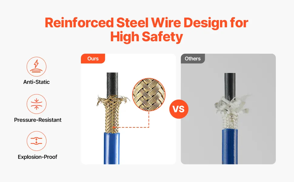 Antideflagrante e resistente alle alte pressioni: costruzione multistrato con treccia metallica integrata, che garantisce resistenza antistatica e alle alte pressioni. Il nostro tubo per spruzzatore di vernice può sopportare pressioni fino a 4350 psi (305,83 kgf/cm²)