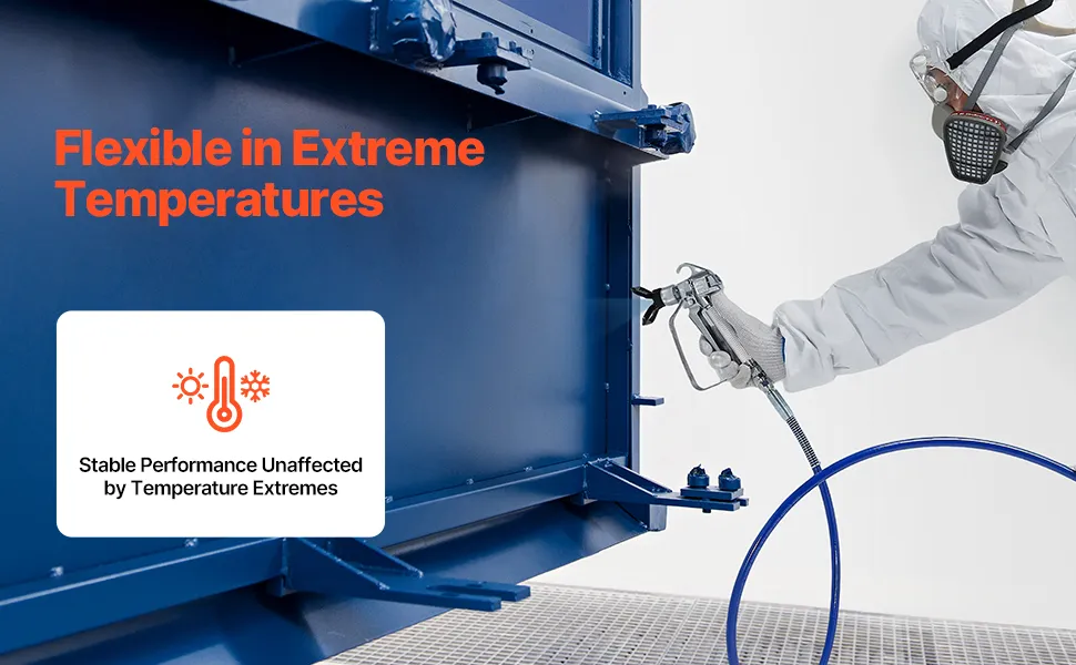 La sua eccellente flessibilità consente al tubo flessibile dell'apparecchio per verniciatura a spruzzo di piegarsi liberamente in spazi ristretti o complessi, rendendolo adattabile a vari ambienti e riducendo al contempo le limitazioni di spazio.