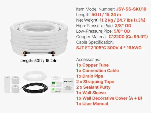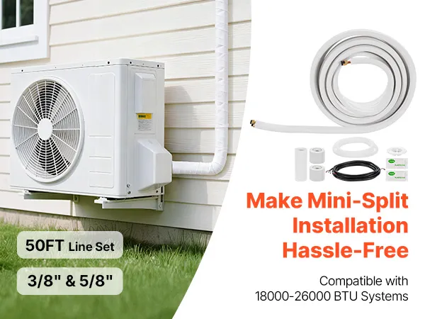 Adatto a più modelli: la configurazione standard linea del liquido da 3/8" + linea di aspirazione da 5/8" si adatta a i sistemi mini-split da 18000-26000 BTU. Set di linee di aria condizionata mini split è progettato per un'ampia compatibilità