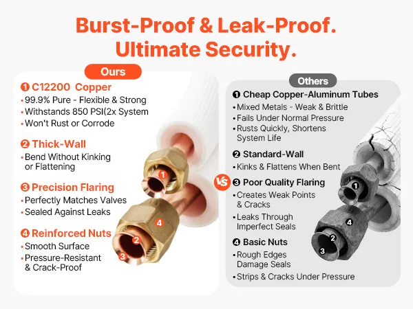 Tubazioni in rame premium da 15 metri: realizzate in rame C12200 puro al 99,9% e con pareti spesse per un'installazione resistente alle pieghe e senza perdite. Ideali per chiunque necessiti di un set di tubazioni in rame mini split