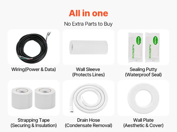 Kit professionale completo: tubo di scarico da 2 metri, manicotto a muro, copertura decorativa, nastro di fissaggio, stucco sigillante. Pronto l'installazione, senza bisogno di acquisti aggiuntivi. Un vero e proprio kit di installazione mini split