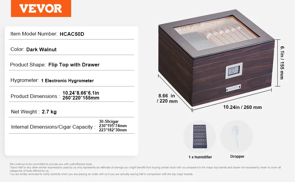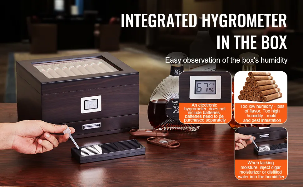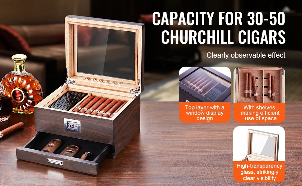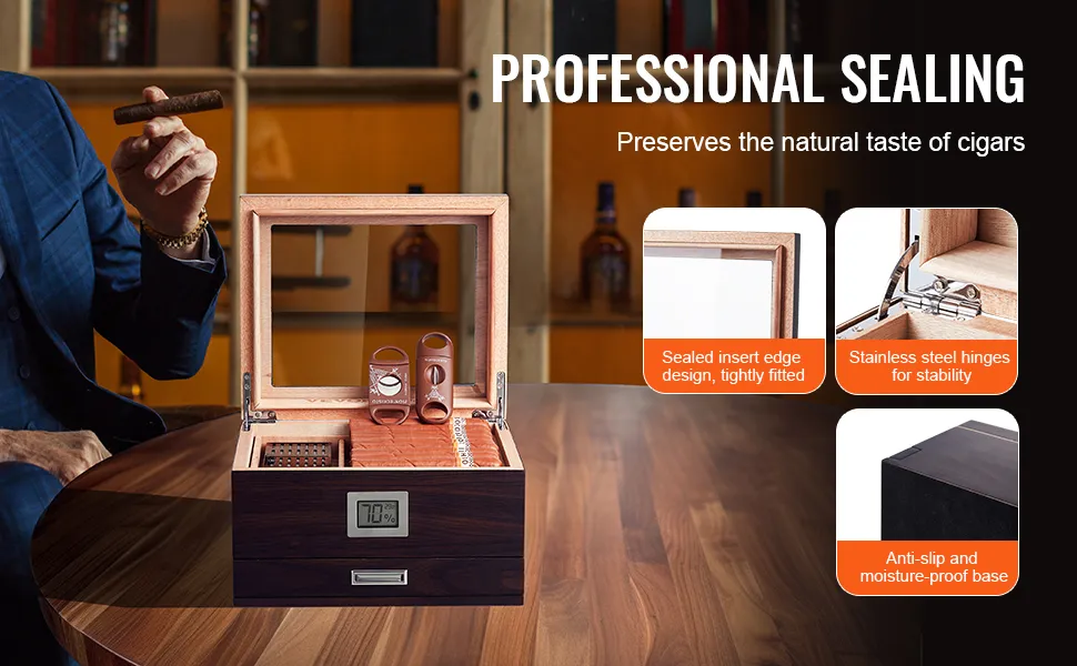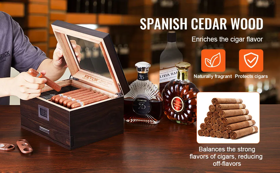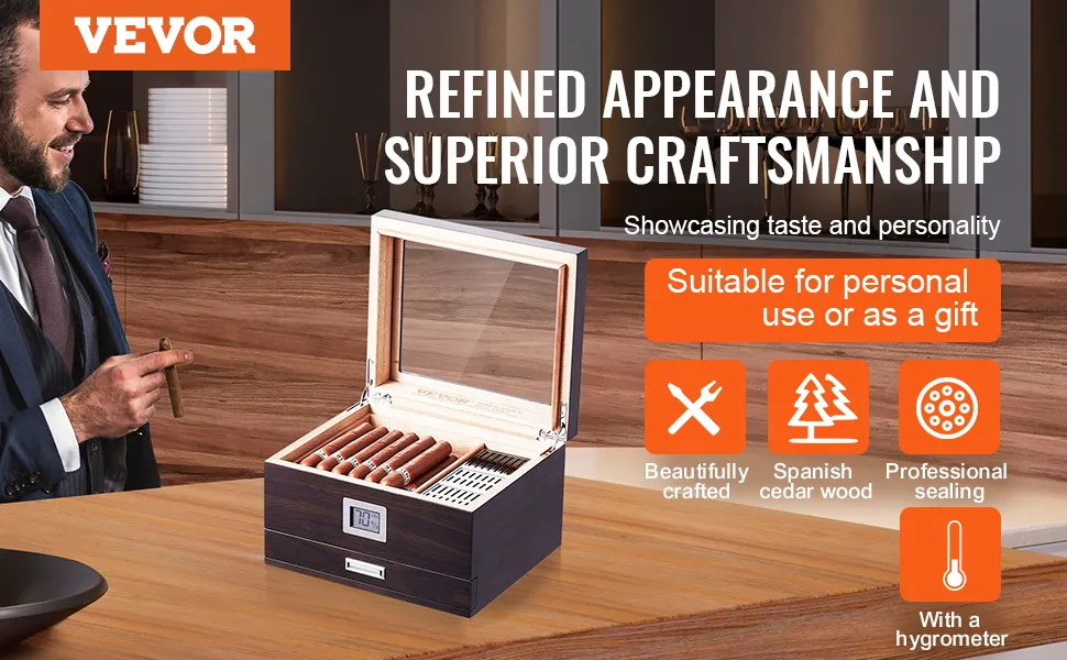 L'humidor per sigari VEVOR 50 è realizzato in pregiato legno di cedro spagnolo. Questo legno mantiene l'umidità ideale per i tuoi sigari. Ne esalta anche il sapore e l'aroma. L'humidor è perfetto per conservare e far invecchiare i sigari. Grazie al suo vetro ad alta trasparenza, puoi facilmente monitorare le tue abitudini di fumo. Puoi monitorare le tue fumate in ogni momento. Il design del bordo sigillato assicura una vestibilità aderente mantenendo al sicuro la freschezza della tua sigaretta. Le cerniere in acciaio inossidabile forniscono stabilità e durata. Ogni humidor è progettato meticolosamente, garantendo longevità e affidabilità.