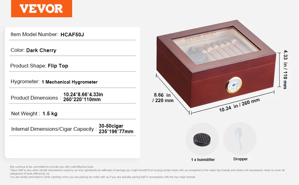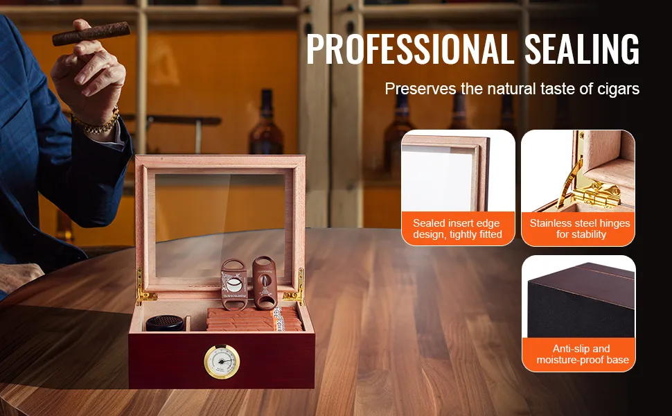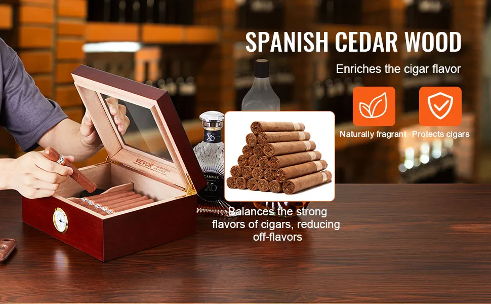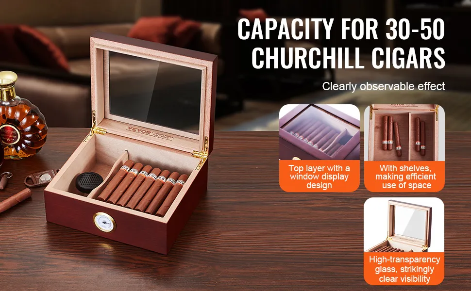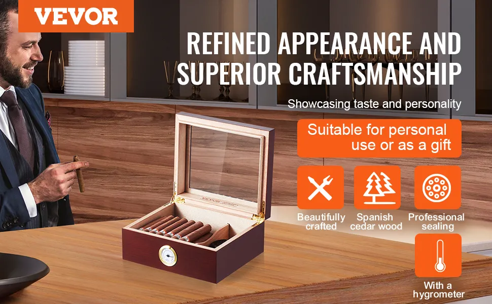L'humidor per sigari VEVOR 50 è realizzato con materiali di alta qualità. Ciò garantisce una finitura laccata dura e audace che resiste all'usura. Ha un aspetto lucido e radioso. Quindi, è perfetto per qualsiasi stanza, che tu sia in soggiorno, studio, camera da letto o cantina. Con questo umidificatore, la tua casa sarà ideale per ogni occasione.