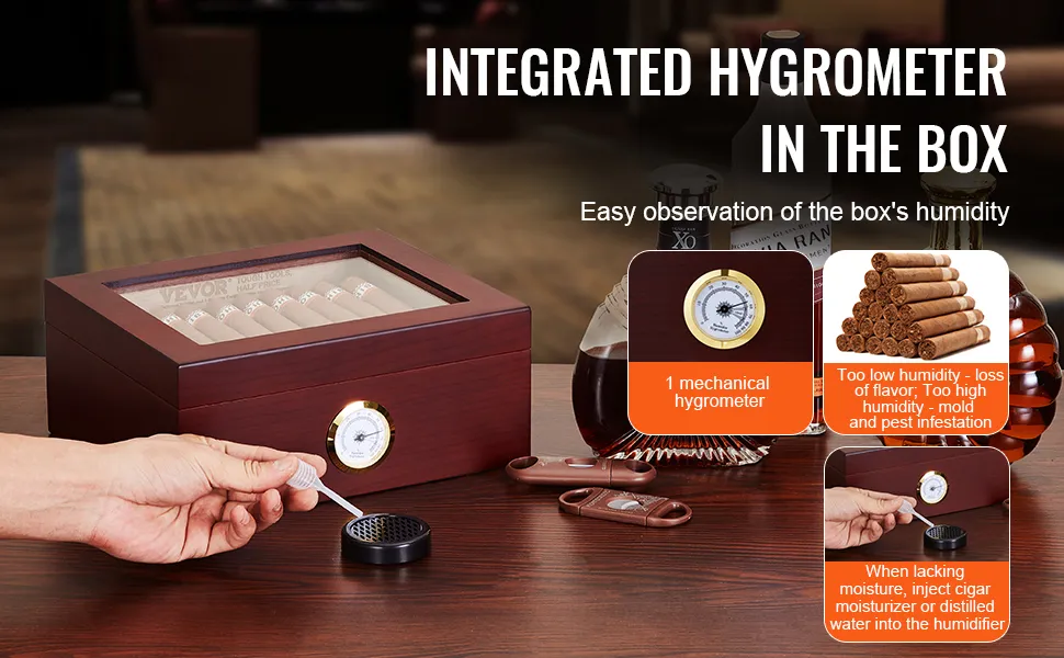 Umidità visibile: la scatola da tavolo per sigari di cedro è dotata di un igrometro per osservare i livelli di umidità all'interno dell'humidor. Quando manca l'umidità, è possibile aggiungere all'umidificatore una soluzione umidificante per sigari o acqua distillata.
