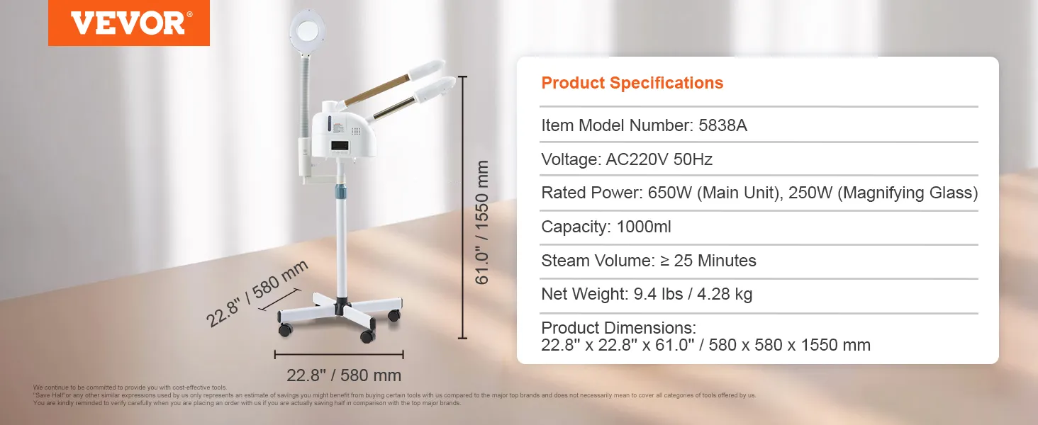VEVOR Vaporizzatore Facciale Nebulizzatori per Viso da Pavimento con Ruote da SPA Salone di Bellezza Funzione 3 in 1 con Lente d'Ingrandimento 5X Modalità Caldo/Freddo, Macchina Vaporizzatore per Viso