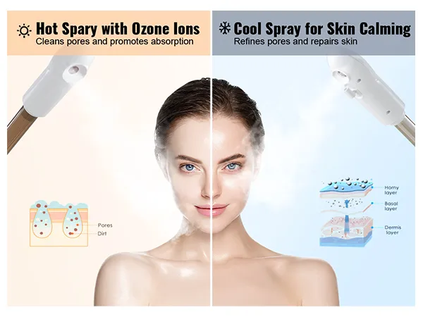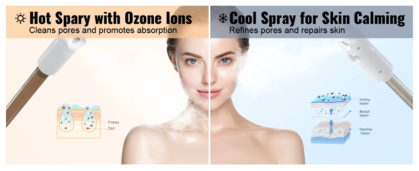 Scoprite il meglio della cura della pelle con il nostro vaporizzatore facciale 3 in 1. La possibilità di scegliere tra nebbia calda e fredda. Il vapore arricchito di ozono apre i pori, con un'idratazione di lunga durata.