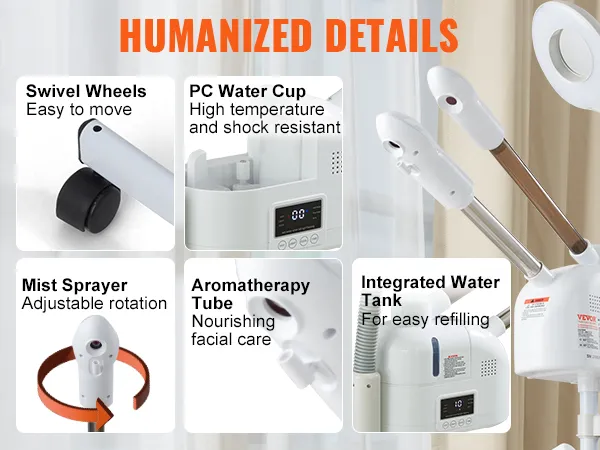 Il vaporizzatore per viso è dotato di un serbatoio dell'acqua all-in-one. Le ruote stabili lo rendono facile da spostare. Inoltre, include un tubo per l'aromaterapia per infondere i vostri oli essenziali preferiti per idratare e nutrire la pelle.