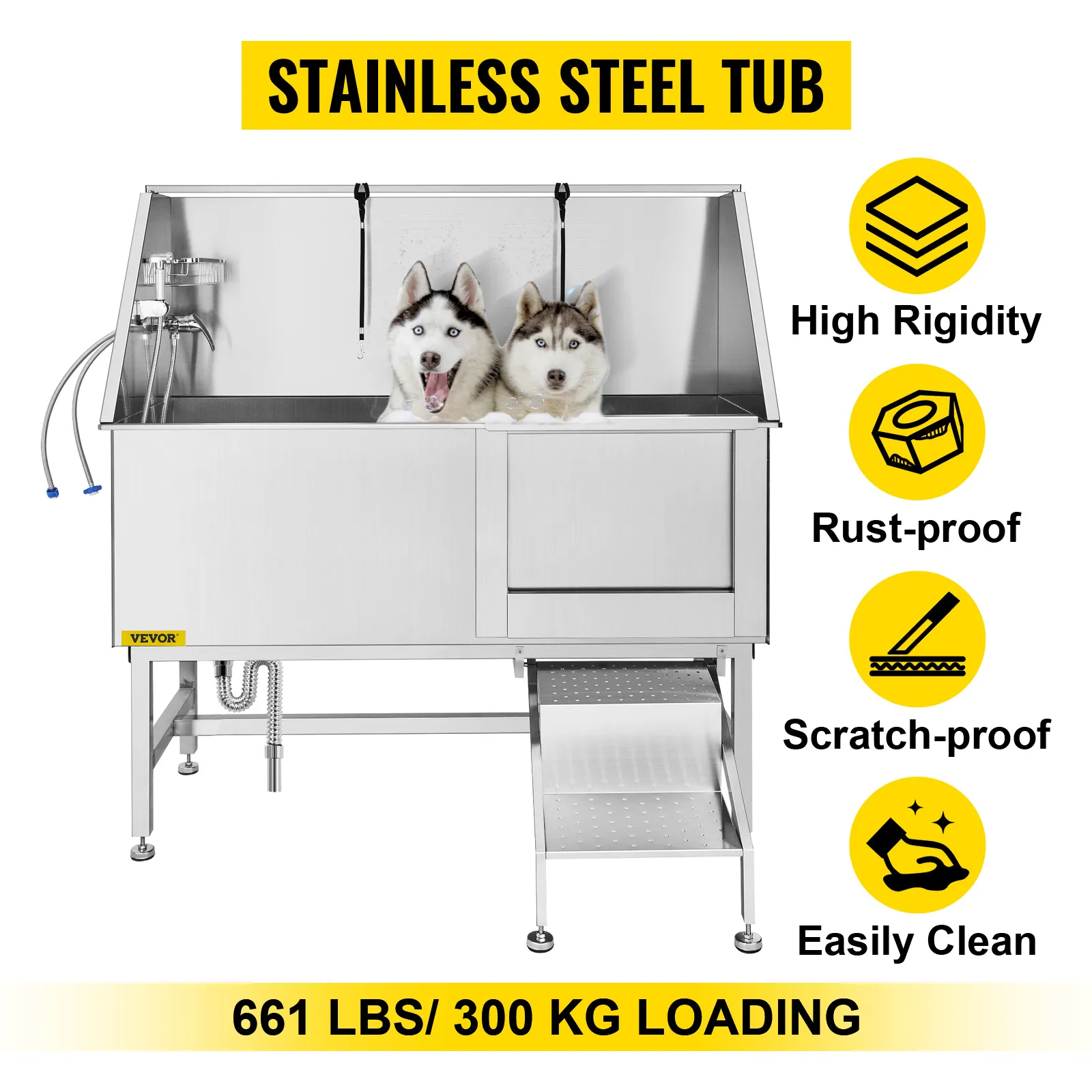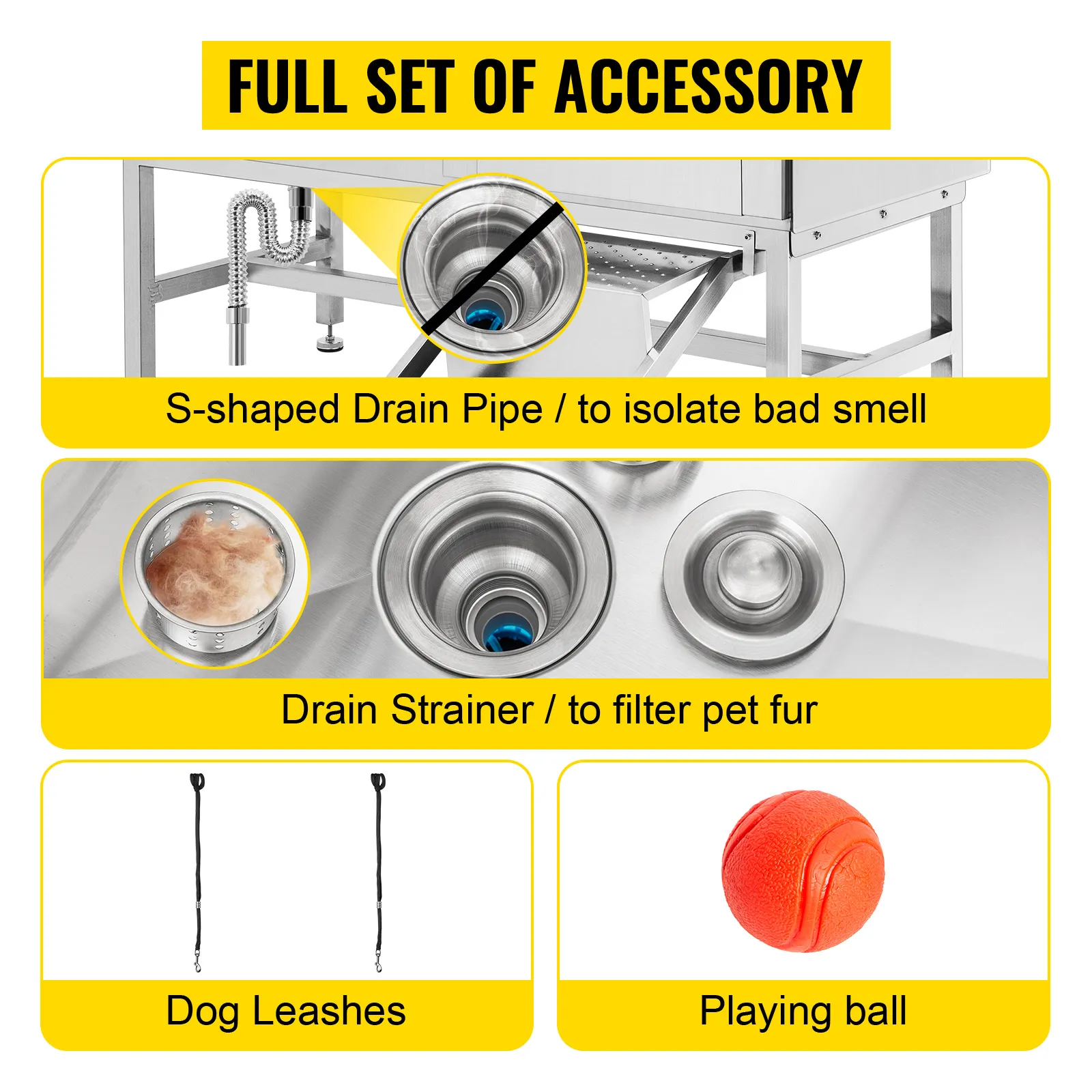 Considerando questi fattori, la nostra vasca da toelettatura professionale VEVOR è dotata di tutti gli accessori necessari per poter lavare il tuo cane senza difficoltà. Metti le mani su questa vasca da bagno per animali domestici e pulisci piacevolmente il tuo cane.