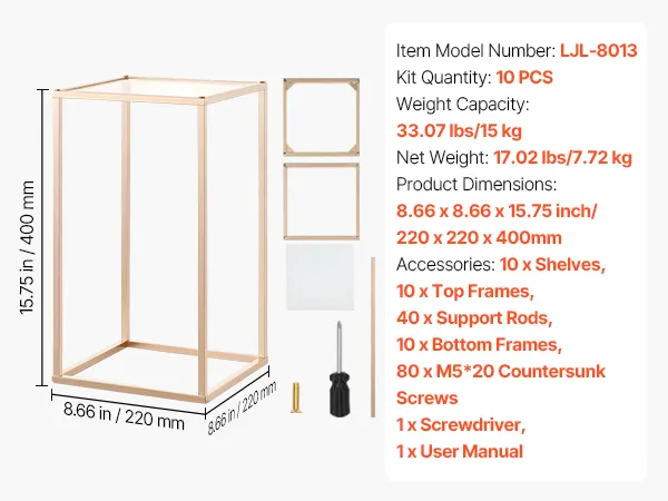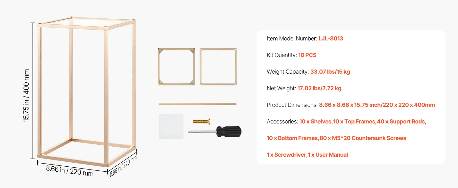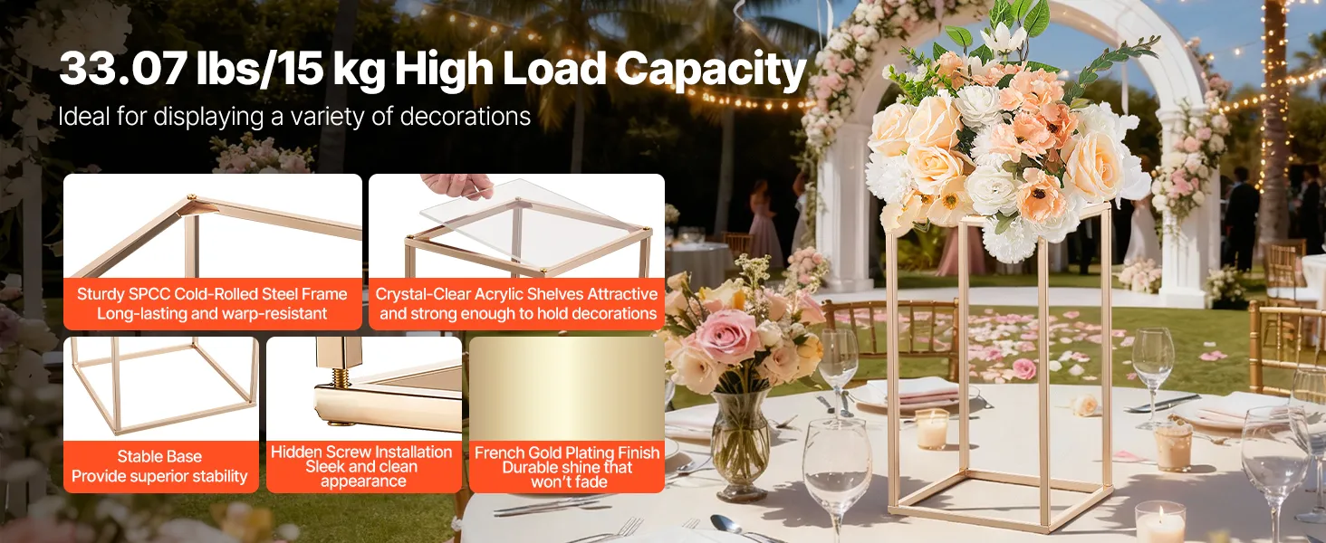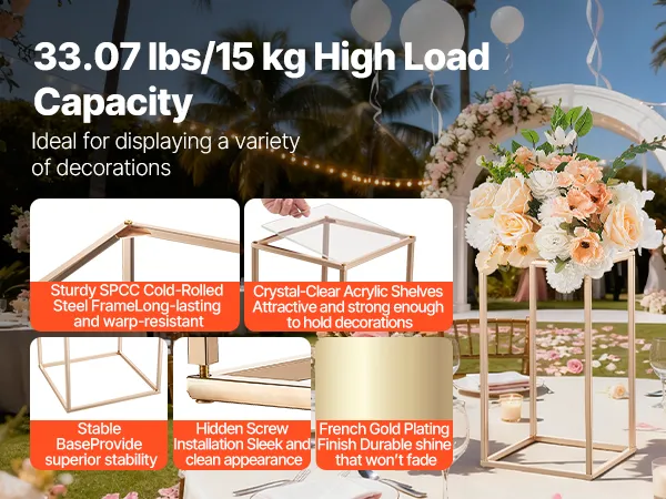 Arricchisci i tuoi eventi con questo portafiori da matrimonio composto da 10 pezzi. La struttura a cubo rettangolare supporta fino a 15 kg ed è realizzata in robusto acciaio SPCC con ripiani in acrilico trasparente rifiniti in oro francese. I componenti completi consentono un facile montaggio.