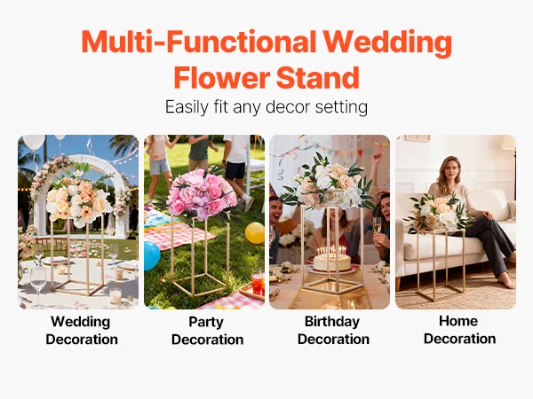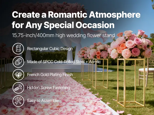 Forma solida ed elegante: progettato con eleganza e stabilità, questo supporto per fiori color oro presenta una forma cubica rettangolare. Con una portata fino a 15 kg, può ospitare fiori o decorazioni aggiungendo un tocco sofisticato a matrimoni