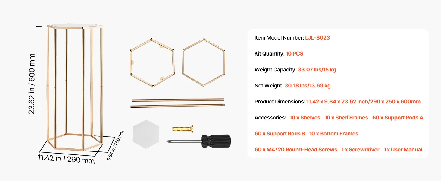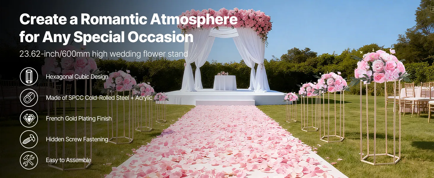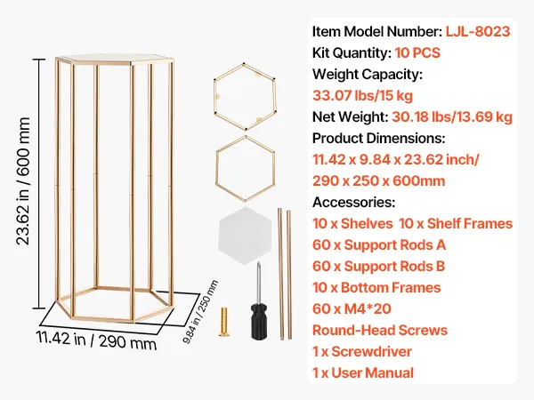 VEVOR Portafiori da Matrimonio 10 Pezzi da 60 cm, Cubico Esagonale con Laminato Acrilico, Espositore Floreale Cubico Cilindrico per Matrimoni, Feste, Compleanni, Casa, Centrotavola Dorati